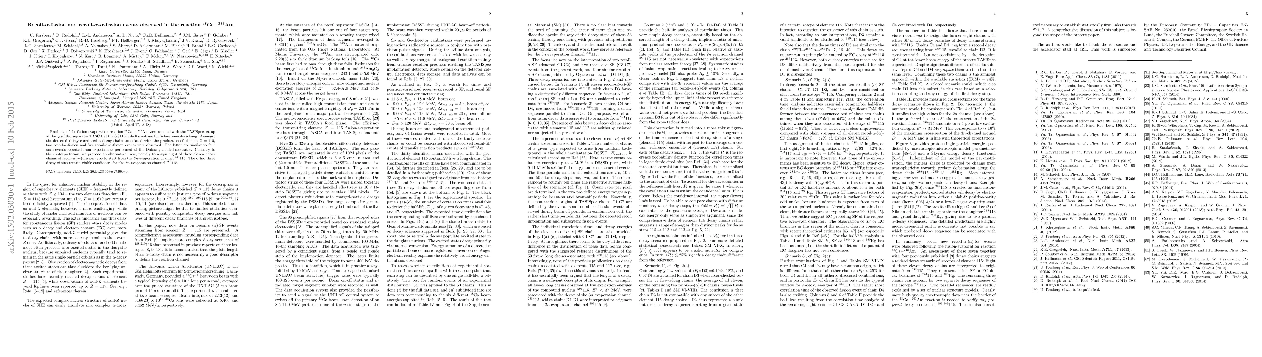 This study observed recoil-alpha-fission and recoil-alpha-alpha-fission events in the Ca-48 + Am-243 reaction, identifying eleven such decay chains linked to element Z=115 production. An alternative interpretation proposes that eight of these events originate from a 3n-evaporation channel, while the remaining three could be from a 2n-evaporation channel.