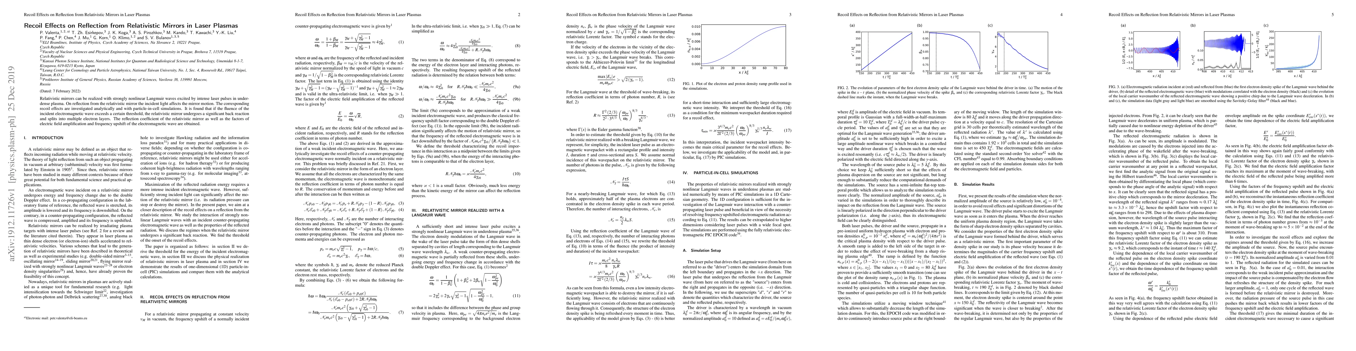 This paper investigates recoil effects on reflection from relativistic mirrors in laser plasmas, finding that high fluence incident waves cause the mirror to split into multiple electron layers. Analytical and simulation results reveal the reflection coefficient and electric field amplification factors.