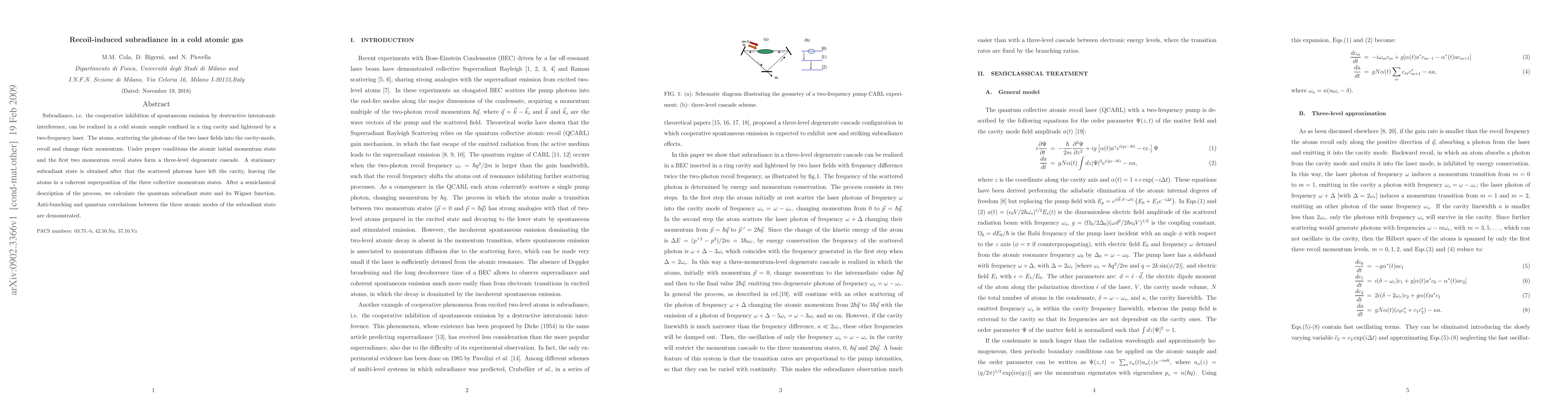 This paper explores subradiance in a cold atomic gas within a ring cavity, where atoms scatter photons from two laser fields, inducing recoil and momentum changes. The system forms a degenerate cascade, leading to a stationary subradiant state with coherent momentum superposition, demonstrating quantum correlations and anti-bunching effects.