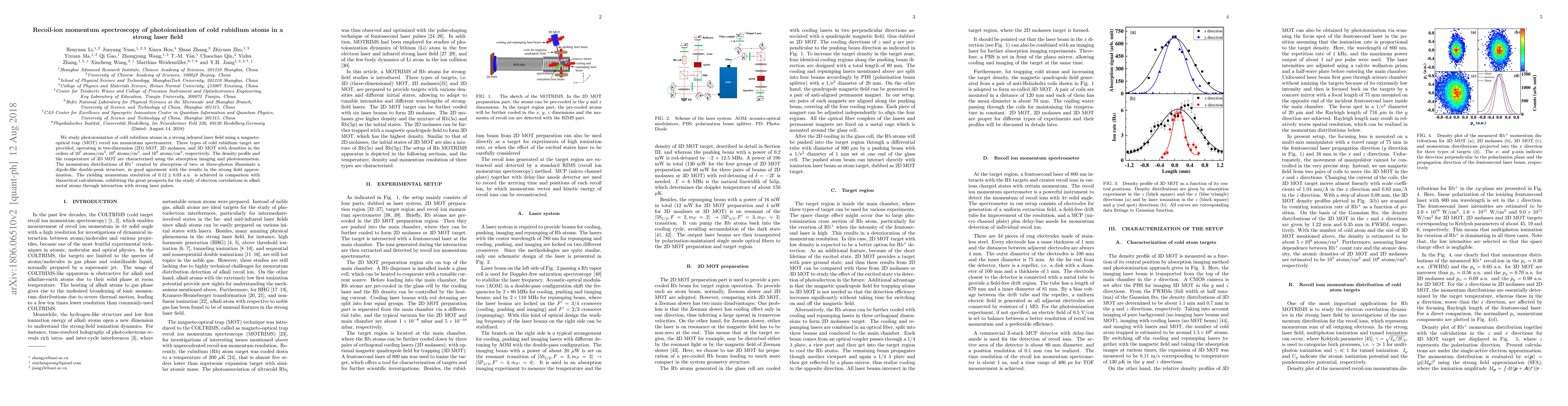 We study photoionization of cold rubidium atoms in a strong infrared laser field using a magneto-optical trap (MOT) recoil ion momentum spectrometer. Three types of cold rubidium target are provided, operating in two-dimension (2D) MOT, 2D molasses, and 3D MOT with densities in the orders of $10^7$ atoms/cm$^3$, $10^8$ atoms/cm$^3$, and $10^9$ atoms/cm$^3$, respectively. The density profile and the temperature of 3D MOT are characterized using the absorption imaging and photoionization. The momentum distributions of Rb$^+$ created by absorption of two- or three-photon illuminate a dipole-like double-peak structure, in good agreement with the results in the strong field approximation. The yielding momentum resolution of $0.12 \pm 0.03$ a.u. is achieved in comparison with theoretical calculations, exhibiting the great prospects for the study of electron correlations in alkali metal atoms through interaction with strong laser pulses.