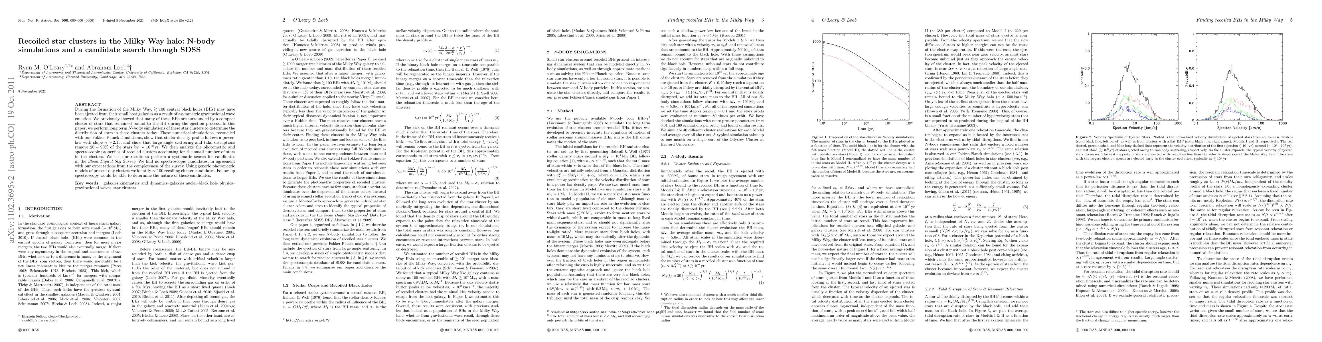 During the formation of the Milky Way, > 100 central black holes (BHs) may have been ejected from their small host galaxies as a result of asymmetric gravitational wave emission. We previously showed that many of these BHs are surrounded by a compact cluster of stars that remained bound to the BH during the ejection process. In this paper, we perform long term N-body simulations of these star clusters to determine the distribution of stars in these clusters today. These numerical simulations, reconciled with our Fokker-Planck simulations, show that stellar density profile follows a power-law with slope ~ -2.15, and show that large angle scattering and tidal disruptions remove 20 - 90% of the stars by ~10^10 yr. We then analyze the photometric and spectroscopic properties of recoiled clusters accounting for the small number of stars in the clusters. We use our results to perform a systematic search for candidates in the Sloan Digital Sky Survey. We find no spectroscopic candidates, in agreement with our expectations from the completeness of the survey. Using generic photometric models of present day clusters we identify ~100 recoiling cluster candidates. Follow-up spectroscopy would be able to determine the nature of these candidates.