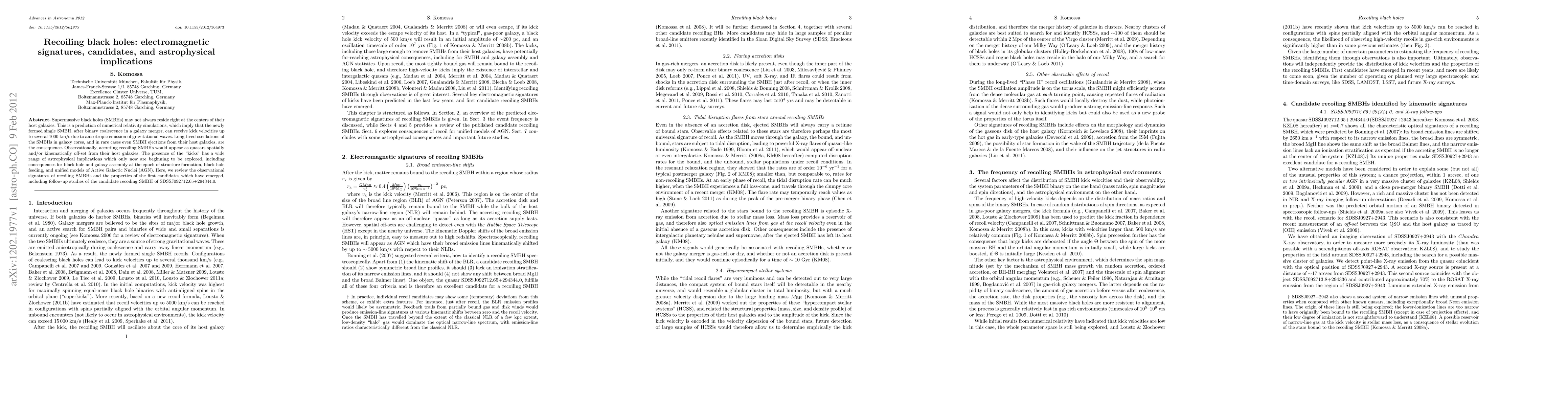 This paper reviews the electromagnetic signatures and astrophysical implications of supermassive black holes (SMBHs) that receive "kicks" from gravitational wave emission during galaxy mergers, potentially leading to their displacement from galactic centers. It discusses observational candidates and the consequences for black hole and galaxy evolution.