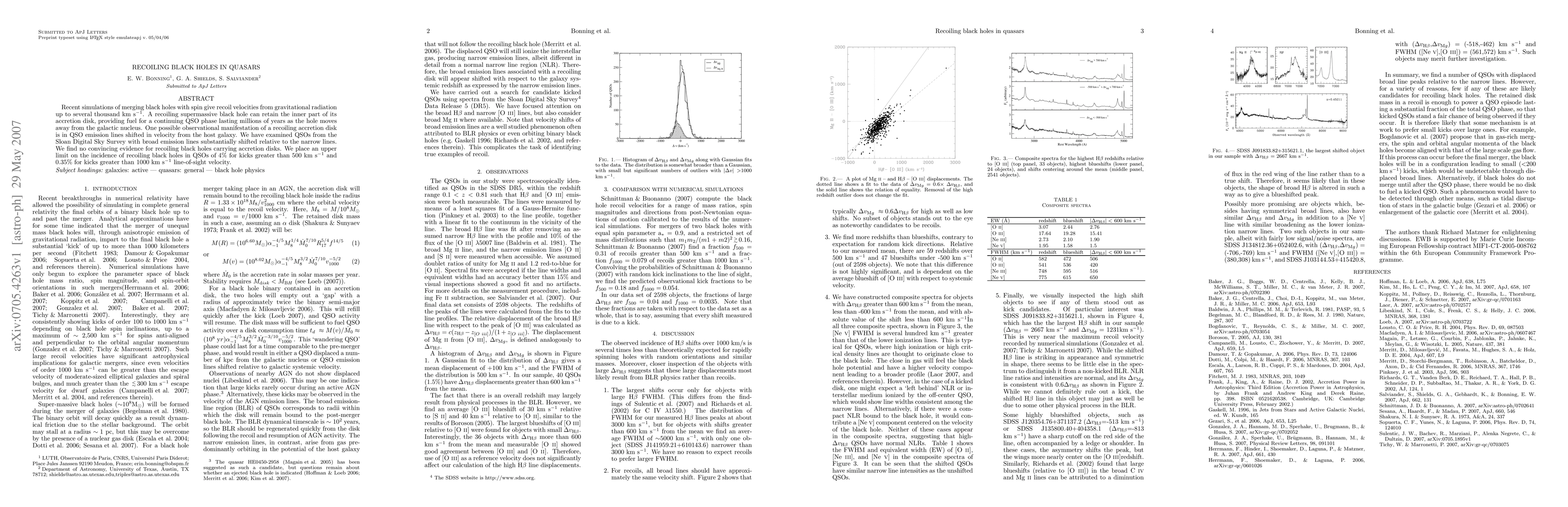Recent simulations of merging black holes with spin give recoil velocities from gravitational radiation up to several thousand km/s. A recoiling supermassive black hole can retain the inner part of its accretion disk, providing fuel for a continuing QSO phase lasting millions of years as the hole moves away from the galactic nucleus. One possible observational manifestation of a recoiling accretion disk is in QSO emission lines shifted in velocity from the host galaxy. We have examined QSOs from the Sloan Digital Sky Survey with broad emission lines substantially shifted relative to the narrow lines. We find no convincing evidence for recoiling black holes carrying accretion disks. We place an upper limit on the incidence of recoiling black holes in QSOs of 4% for kicks greater than 500 km/s and 0.35% for kicks greater than 1000 km/s line-of-sight velocity.