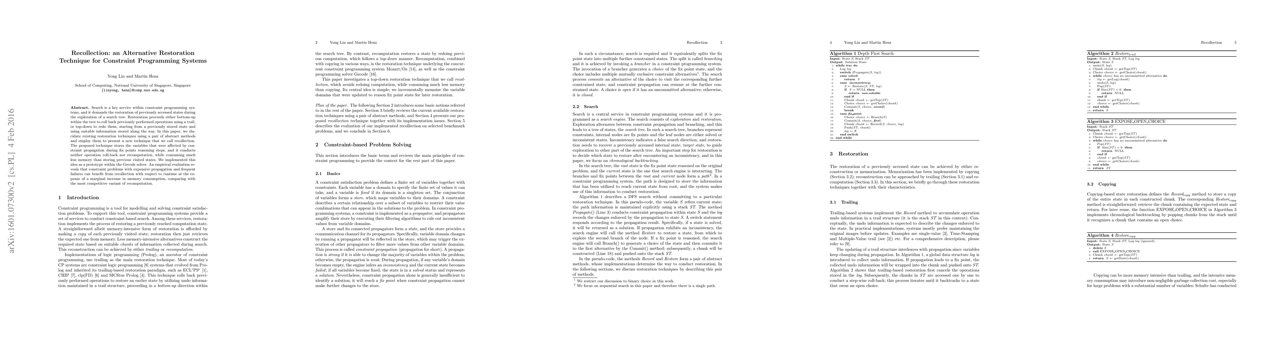 Search is a key service within constraint programming systems, and it demands the restoration of previously accessed states during the exploration of a search tree. Restoration proceeds either bottom-up within the tree to roll back previously performed operations using a trail, or top-down to redo them, starting from a previously stored state and using suitable information stored along the way. In this paper, we elucidate existing restoration techniques using a pair of abstract methods and employ them to present a new technique that we call recollection. The proposed technique stores the variables that were affected by constraint propagation during fix points reasoning steps, and it conducts neither operation roll-back nor recomputation, while consuming much less memory than storing previous visited states. We implemented this idea as a prototype within the Gecode solver. An empirical evaluation reveals that constraint problems with expensive propagation and frequent failures can benefit from recollection with respect to runtime at the expense of a marginal increase in memory consumption, comparing with the most competitive variant of recomputation.
