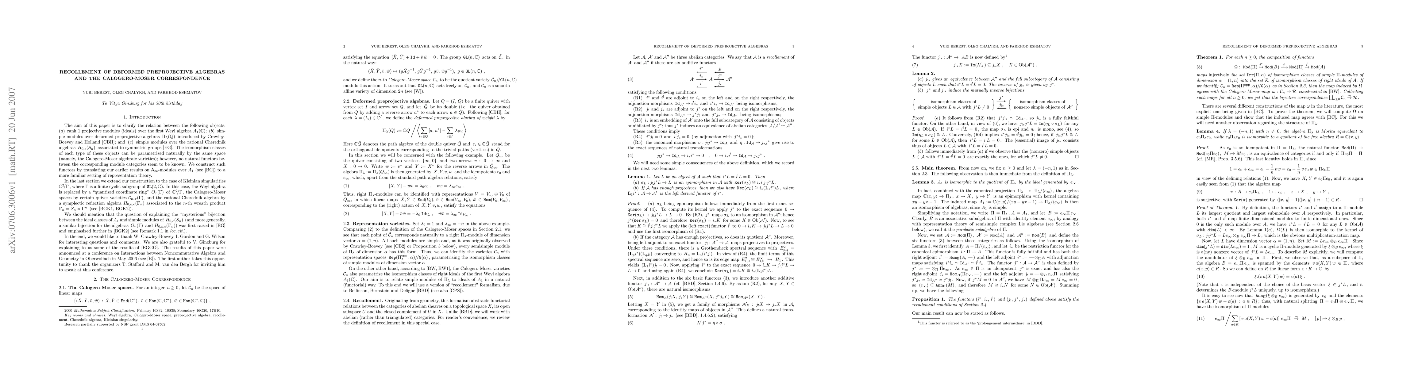The aim of this paper is to clarify the relation between the following objects: $ (a) $ rank 1 projective modules (ideals) over the first Weyl algebra $ A_1(\C)$; $ (b) $ simple modules over deformed preprojective algebras $ \Pi_{\lambda}(Q) $ introduced by Crawley-Boevey and Holland; and $ (c) $ simple modules over the rational Cherednik algebras $ H_{0,c}(S_n) $ associated to symmetric groups. The isomorphism classes of each type of these objects can be parametrized geometrically by the same space (namely, the Calogero-Moser algebraic varieties); however, no natural functors between the corresponding module categories seem to be known. We construct such functors by translating our earlier results on $\A$-modules over $ A_1 $ to a more familiar setting of representation theory. In the last section we extend our construction to the case of Kleinian singularities $ \C^2/\Gamma $, where $ \Gamma $ is a finite cyclic subgroup of $ \SL(2, \C) $.