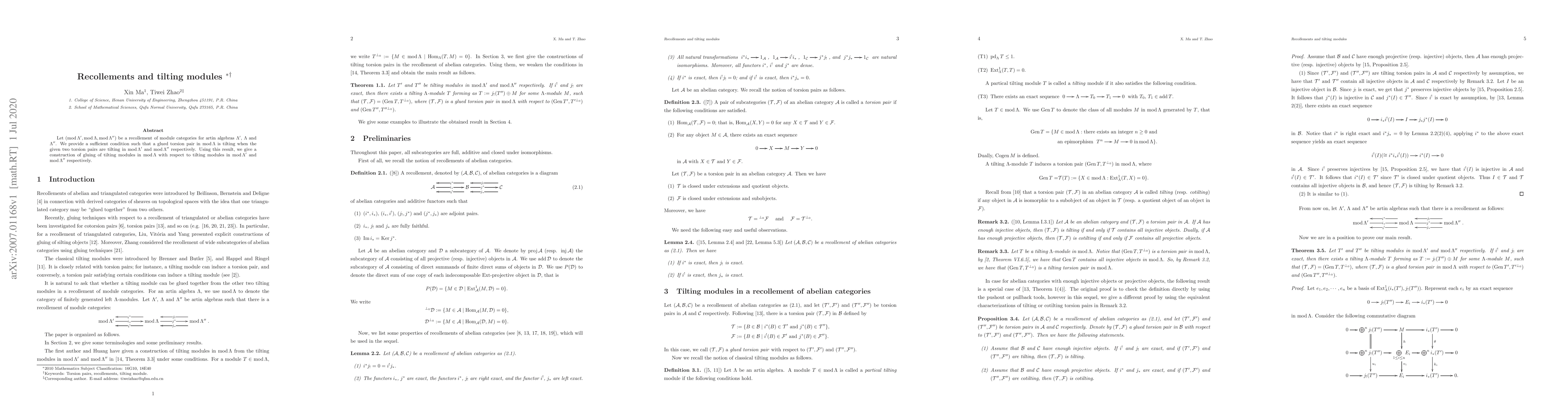 This paper studies recollement of module categories for artin algebras and provides a condition for a glued torsion pair in mod Λ to be tilting, given that certain torsion pairs in mod Λ' and mod Λ'' are tilting. It also constructs a method for gluing tilting modules in mod Λ from tilting modules in mod Λ' and mod Λ''.
