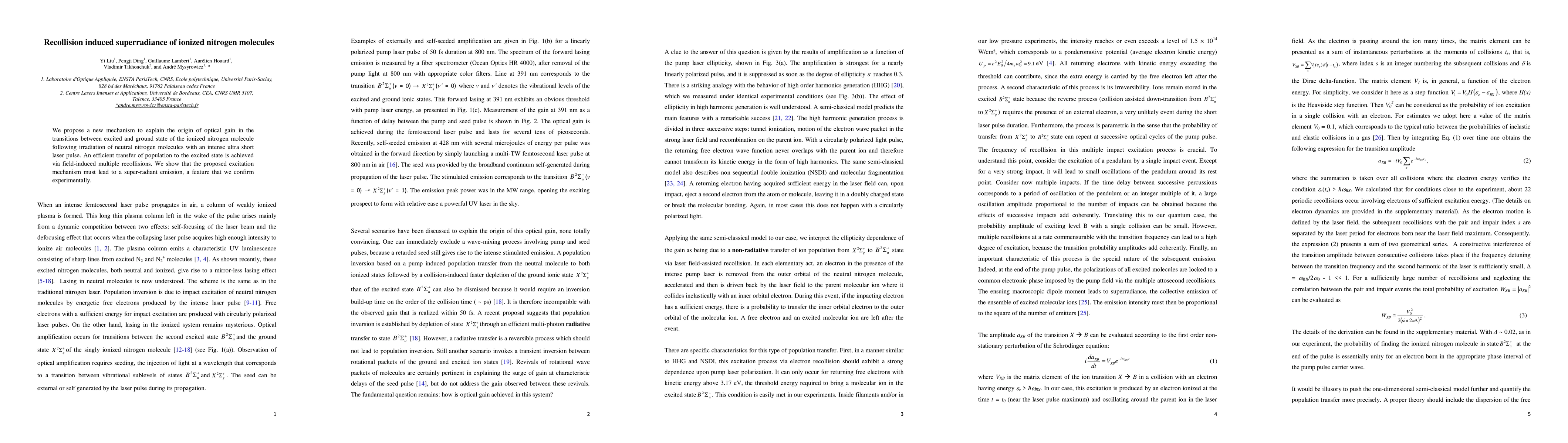 This paper proposes a mechanism for optical gain in ionized nitrogen molecules via intense ultra-short laser pulses, demonstrating efficient population transfer through multiple recollisions and confirming super-radiant emission experimentally.