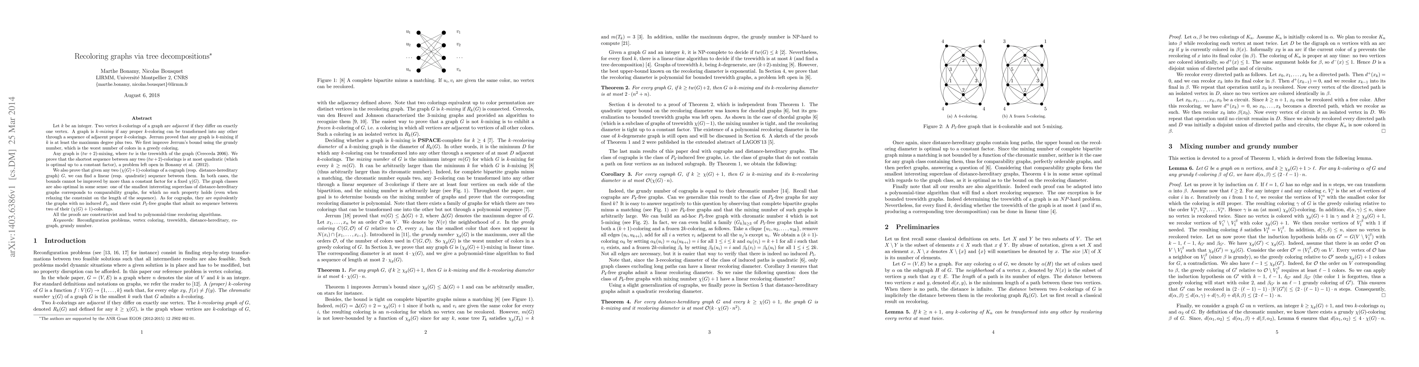 Let $k$ be an integer. Two vertex $k$-colorings of a graph are \emph{adjacent} if they differ on exactly one vertex. A graph is \emph{$k$-mixing} if any proper $k$-coloring can be transformed into any other through a sequence of adjacent proper $k$-colorings. Jerrum proved that any graph is $k$-mixing if $k$ is at least the maximum degree plus two. We first improve Jerrum's bound using the grundy number, which is the worst number of colors in a greedy coloring. Any graph is $(tw+2)$-mixing, where $tw$ is the treewidth of the graph (Cereceda 2006). We prove that the shortest sequence between any two $(tw+2)$-colorings is at most quadratic (which is optimal up to a constant factor), a problem left open in Bonamy et al. (2012). We also prove that given any two $(\chi(G)+1)$-colorings of a cograph (resp. distance-hereditary graph) $G$, we can find a linear (resp. quadratic) sequence between them. In both cases, the bounds cannot be improved by more than a constant factor for a fixed $\chi(G)$. The graph classes are also optimal in some sense: one of the smallest interesting superclass of distance-hereditary graphs corresponds to comparability graphs, for which no such property holds (even when relaxing the constraint on the length of the sequence). As for cographs, they are equivalently the graphs with no induced $P_4$, and there exist $P_5$-free graphs that admit no sequence between two of their $(\chi(G)+1)$-colorings. All the proofs are constructivist and lead to polynomial-time recoloring algorithm