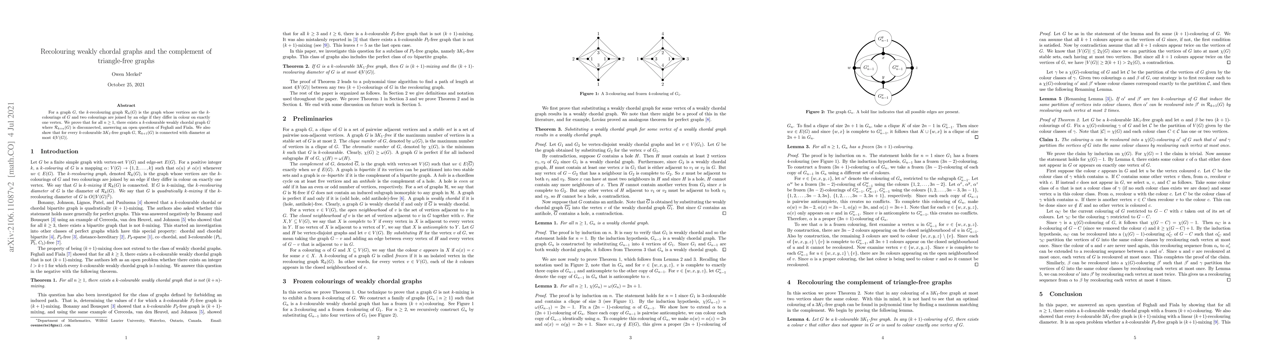 Summary: This paper demonstrates that for certain weakly chordal graphs, the $k$-recolouring graph $\mathcal{R}_{k+n}(G)$ can be disconnected. It also proves that for triangle-free graphs, $\mathcal{R}_{k+1}(G)$ is always connected with a bounded diameter.