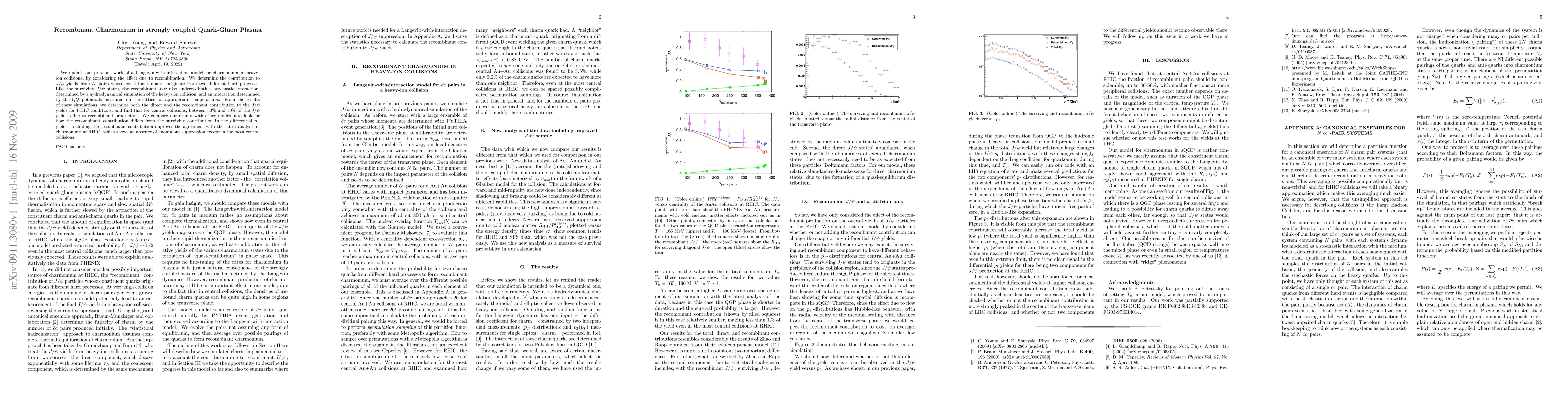 We update our previous work of a Langevin-with-interaction model for charmonium in heavy-ion collisions, by considering the effect due to recombination. We determine the contribution to J/psi yields from charm-anticharm pairs whose constituent quarks originate from two different hard processes. Like the surviving J/psi states, the recombinant J/psi also undergo both a stochastic interaction, determined by a hydrodynamical simulation of the heavy-ion collision, and an interaction determined by the heavy quark-antiquark potentials measured on the lattice for appropriate temperatures. From the results of these simulations, we determine both the direct and the recombinant contribution to the J/psi yields for RHIC conditions, and find that for central collisions, between 30% and 50% of the J/psi yield is due to recombinant production. We compare our results with other models and look for how the recombinant contribution differs from the surviving contribution in the differential p_t yields. Including the recombinant contribution improves the agreement with the latest analysis of charmonium at RHIC, which shows an absence of anomalous suppression except in the most central collisions.