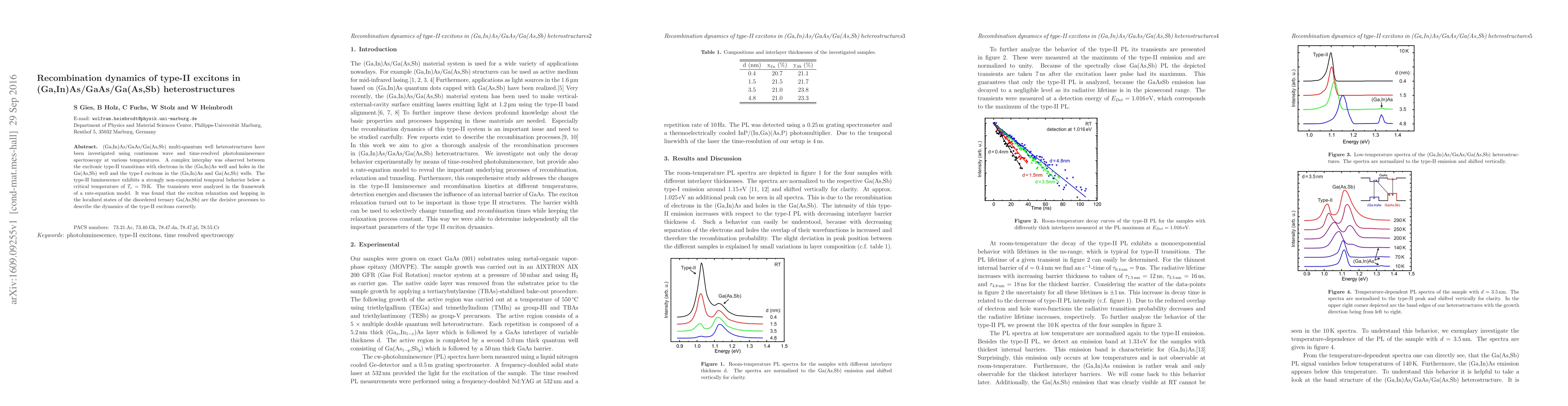 Researchers investigated (Ga,In)As/GaAs/Ga(As,Sb) heterostructures using photoluminescence spectroscopy, finding that type-II excitons exhibit strongly non-exponential temporal behavior below 70K due to localized state hopping.