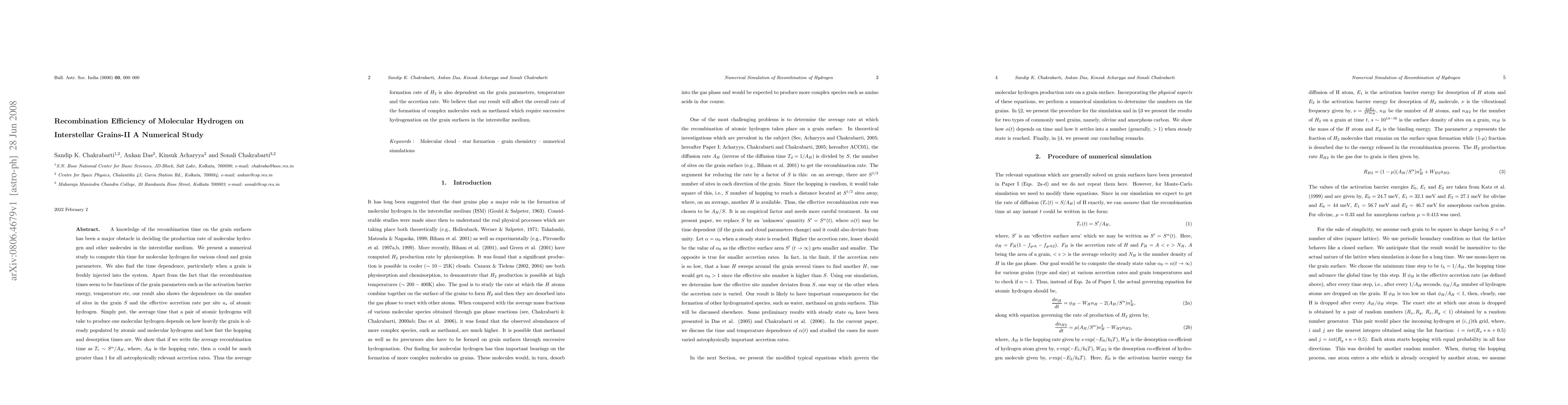 This paper presents a numerical study to determine the recombination time for molecular hydrogen on interstellar grains, finding that the average recombination time depends on grain parameters, temperature, and the accretion rate of atomic hydrogen. The study reveals that the formation rate of H₂ and subsequent complex molecules like methanol is significantly influenced by these factors.