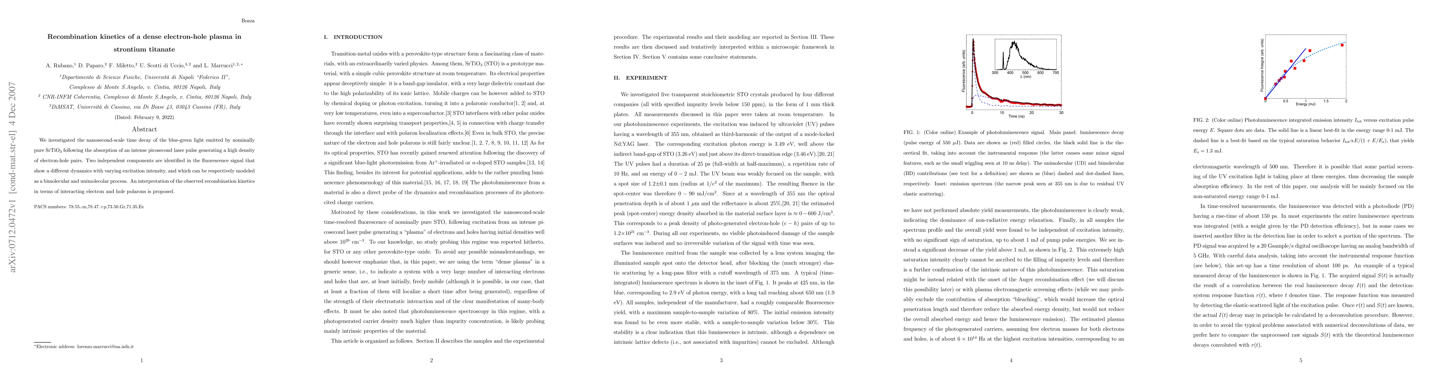 We investigated the nanosecond-scale time decay of the blue-green light emitted by nominally pure SrTiO$_3$ following the absorption of an intense picosecond laser pulse generating a high density of electron-hole pairs. Two independent components are identified in the fluorescence signal that show a different dynamics with varying excitation intensity, and which can be respectively modeled as a bimolecular and unimolecolar process. An interpretation of the observed recombination kinetics in terms of interacting electron and hole polarons is proposed.