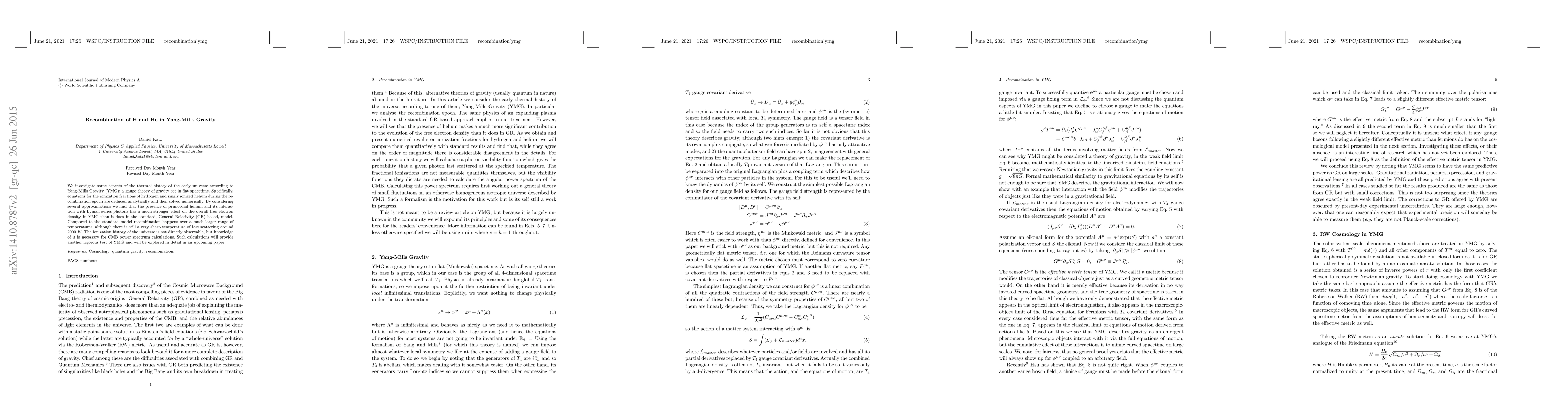 We investigate some aspects of the thermal history of the early universe according to Yang-Mills Gravity (YMG); a gauge theory of gravity set in flat spacetime. Specifically, equations for the ionization fractions of hydrogen and singly ionized helium during the recombination epoch are deduced analytically and then solved numerically. By considering several approximations we find that the presence of primordial helium and its interaction with Lyman series photons has a much stronger effect on the overall free electron density in YMG than it does in the standard, General Relativity (GR) based, model. Compared to the standard model recombination happens over a much larger range of temperatures, although there is still a very sharp temperature of last scattering around 2000 K. Since the ionization history of the universe is not directly observable we discuss how one may use it to predict the CMB power spectrum and thus test YMG. This topic will be explored in detail in an upcoming paper.