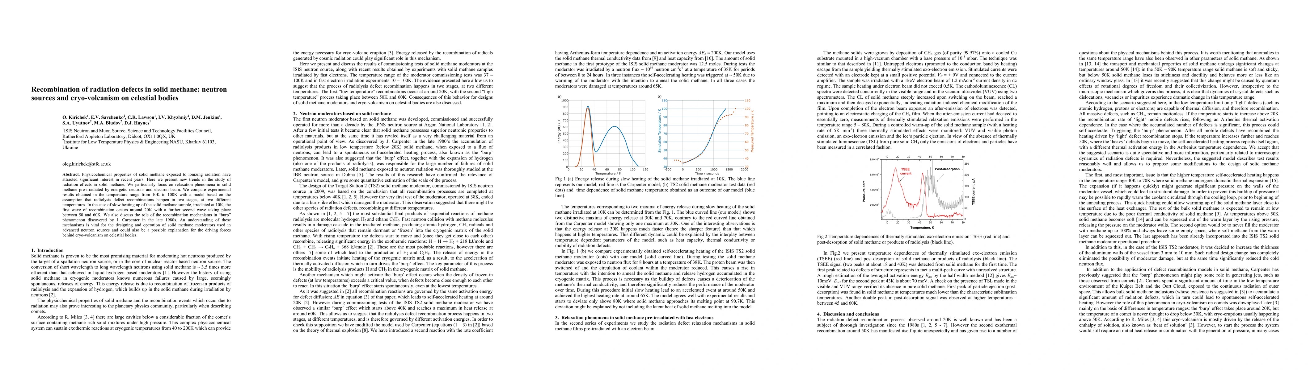 This paper investigates the recombination of radiation defects in solid methane, focusing on the temperature-dependent relaxation phenomena following neutron and electron beam irradiation. The study reveals two-stage recombination processes occurring at different temperatures, which may explain the cryo-volcanism observed on celestial bodies and inform the design of neutron sources.