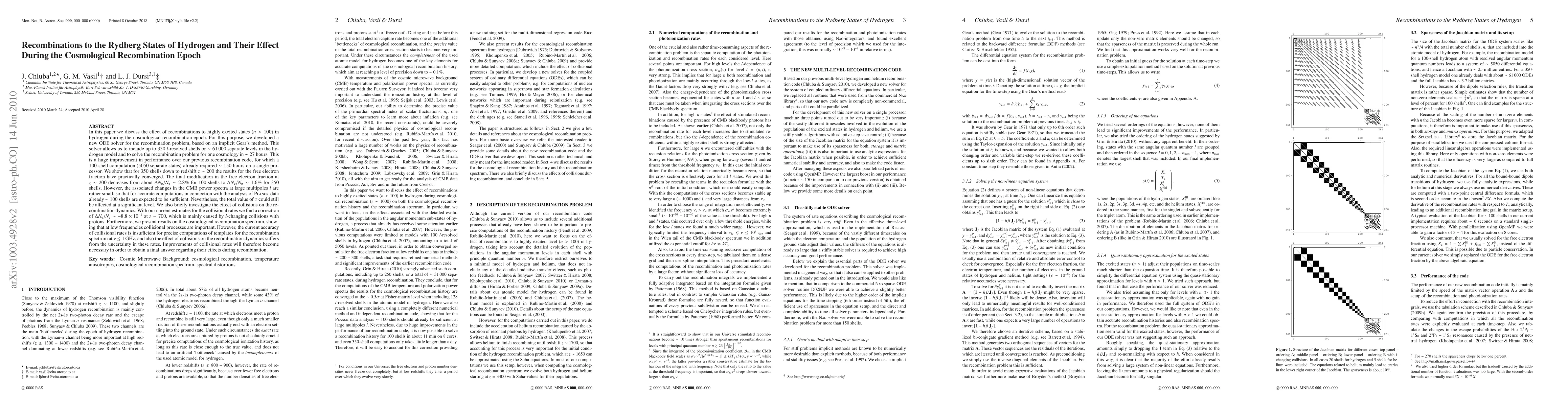 This paper develops a new ODE solver for modeling hydrogen recombinations to highly excited states (n > 100) during the cosmological recombination epoch, showing significant performance improvements. The results indicate that while more shells improve electron fraction accuracy, collisional effects remain uncertain and limit precise recombination spectrum computations.