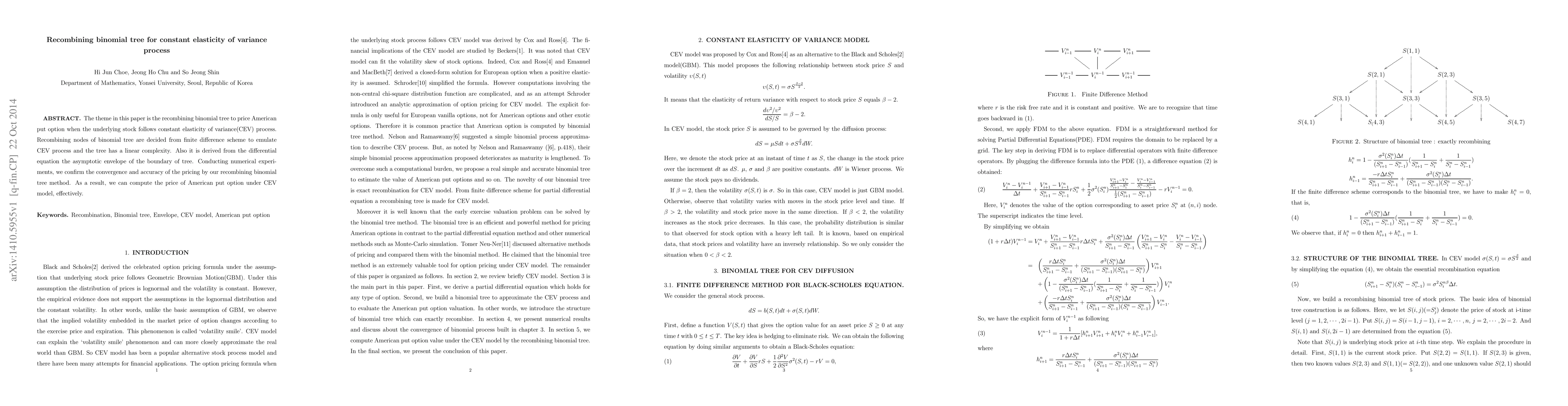 The theme in this paper is the recombining binomial tree to price American put option when the underlying stock follows constant elasticity of variance(CEV) process. Recombining nodes of binomial tree are decided from finite difference scheme to emulate CEV process and the tree has a linear complexity. Also it is derived from the differential equation the asymptotic envelope of the boundary of tree. Conducting numerical experiments, we confirm the convergence and accuracy of the pricing by our recombining binomial tree method. As a result, we can compute the price of American put option under CEV model, effectively.