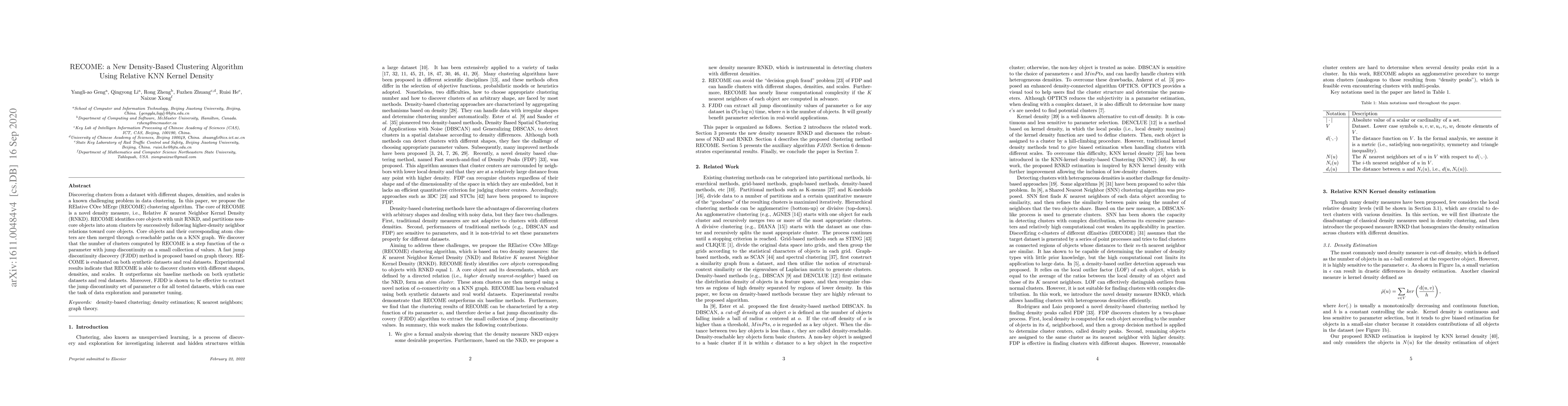 RECOME is a new density-based clustering algorithm that uses a novel Relative KNN Kernel Density measure to identify core objects and partition non-core objects into atom clusters. The algorithm outperforms six baseline methods and effectively discovers clusters with varying shapes, densities, and scales.