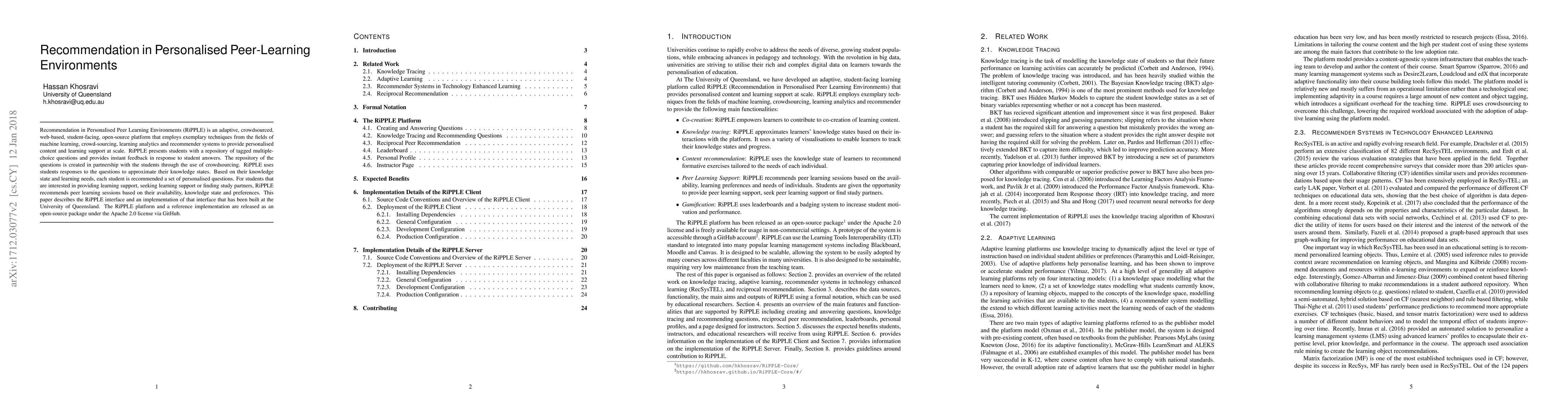 Recommendation in Personalised Peer Learning Environments (RiPPLE) is an adaptive, crowdsourced, web-based, student-facing, open-source platform that employs exemplary techniques from the fields of machine learning, crowdsourcing, learning analytics and recommender systems to provide personalised content and learning support at scale. RiPPLE presents students with a repository of tagged multiple-choice questions and provides instant feedback in response to student answers. The repository of the questions is created in partnership with the students through the use of crowdsourcing. RiPPLE uses students responses to the questions to approximate their knowledge states. Based on their knowledge state and learning needs, each student is recommended a set of personalised questions. For students that are interested in providing learning support, seeking learning support or finding study partners, RiPPLE recommends peer learning sessions based on their availability, knowledge state and preferences. This paper describes the RiPPLE interface and an implementation of that interface that has been built at the University of Queensland. The RiPPLE platform and a reference implementation are released as an open-source package under the Apache 2.0 license via GitHub.