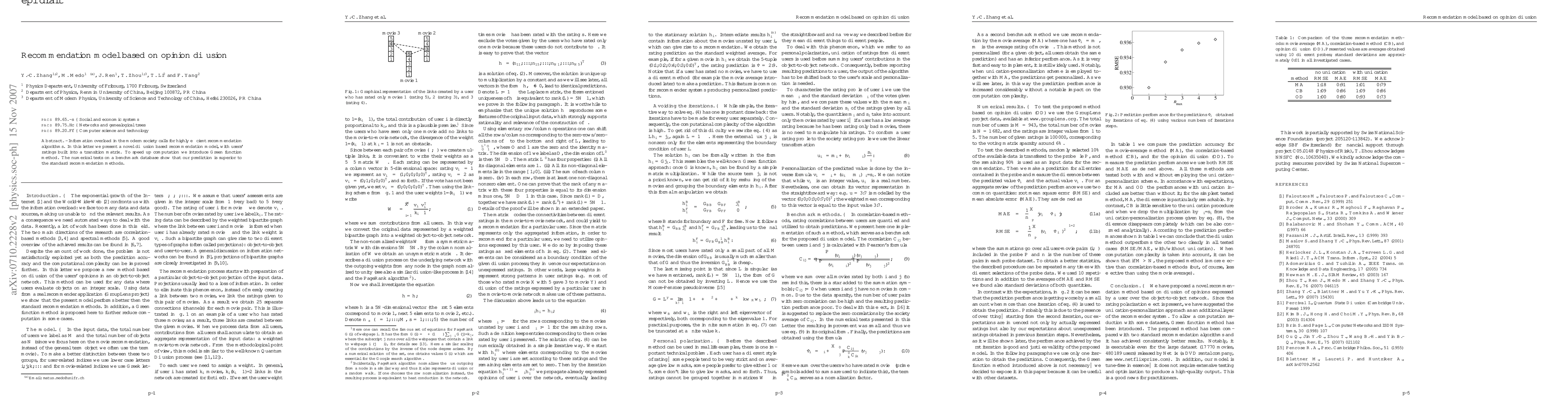 A new recommendation model that leverages opinion diffusion outperforms traditional methods in predicting user ratings, using a transition matrix and Green function method to speed up computation.
