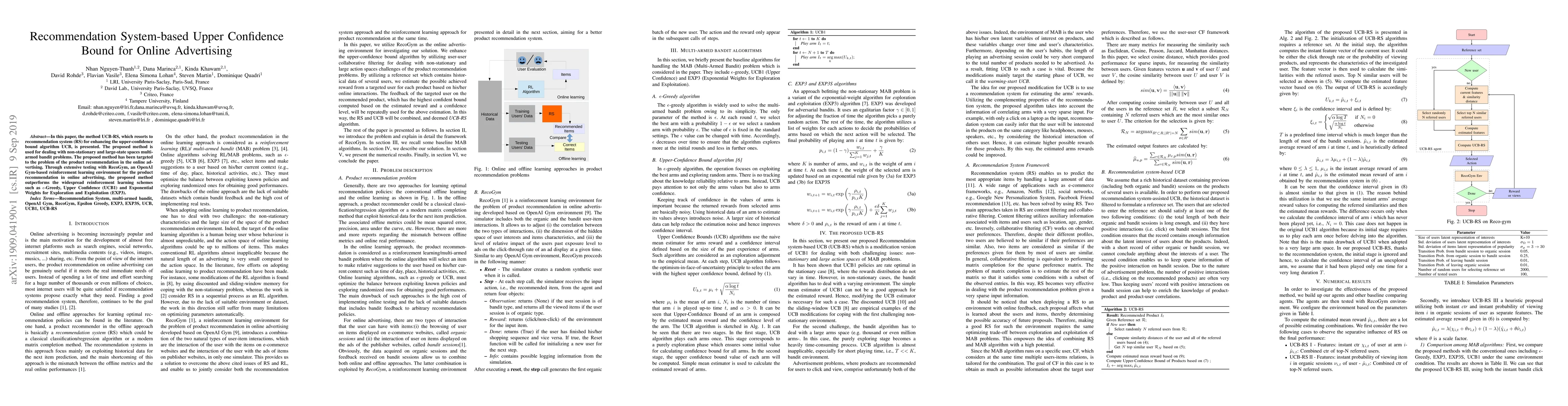 In this paper, the method UCB-RS, which resorts to recommendation system (RS) for enhancing the upper-confidence bound algorithm UCB, is presented. The proposed method is used for dealing with non-stationary and large-state spaces multi-armed bandit problems. The proposed method has been targeted to the problem of the product recommendation in the online advertising. Through extensive testing with RecoGym, an OpenAI Gym-based reinforcement learning environment for the product recommendation in online advertising, the proposed method outperforms the widespread reinforcement learning schemes such as $\epsilon$-Greedy, Upper Confidence (UCB1) and Exponential Weights for Exploration and Exploitation (EXP3).