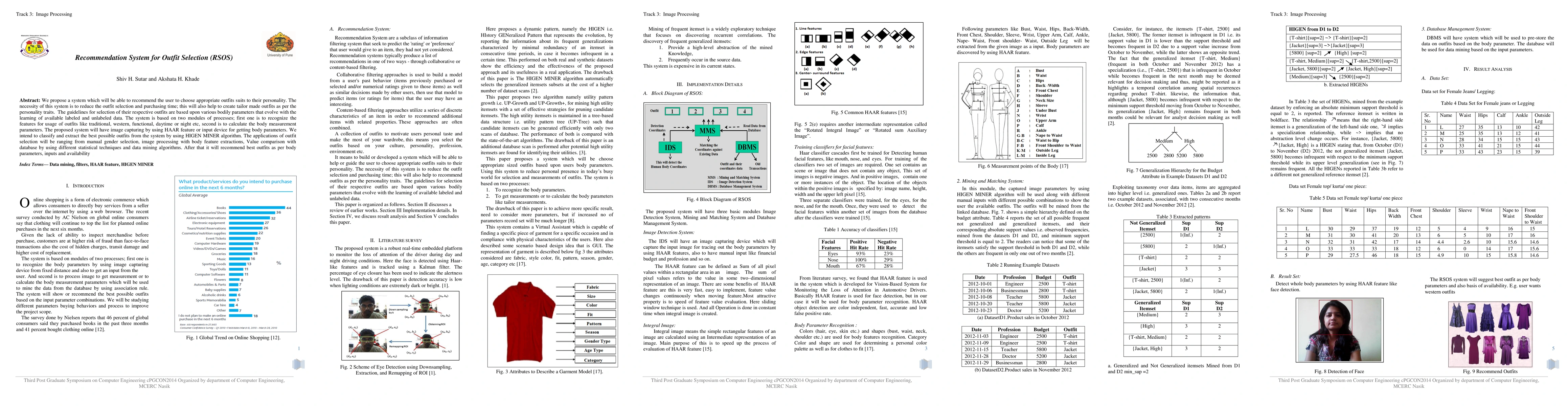 We propose a system which will be able to recommend the user to choose appropriate outfits suits to their personality. The necessity of this system is to reduce the outfit selection and purchasing time; this will also help to create tailor made outfits as per the personality traits. The guidelines for selection of their respective outfits are based upon various bodily parameters that evolve with the learning of available labeled and unlabeled data. The system is based on two modules of processes; first one is to recognize the features for usage of outfits like traditional, western, functional, daytime or night etc, second is to calculate the body measurement parameters. The proposed system will have image capturing by using HAAR feature or input device for getting body parameters. We intend to classify and extract the best possible outfits from the system by using HIGEN MINER algorithm. The applications of outfit selection will be ranging from manual gender selection, image processing with body feature extractions, Value comparison with database by using different statistical techniques and data mining algorithms. After that it will recommend best outfits as per body parameters, inputs and availability