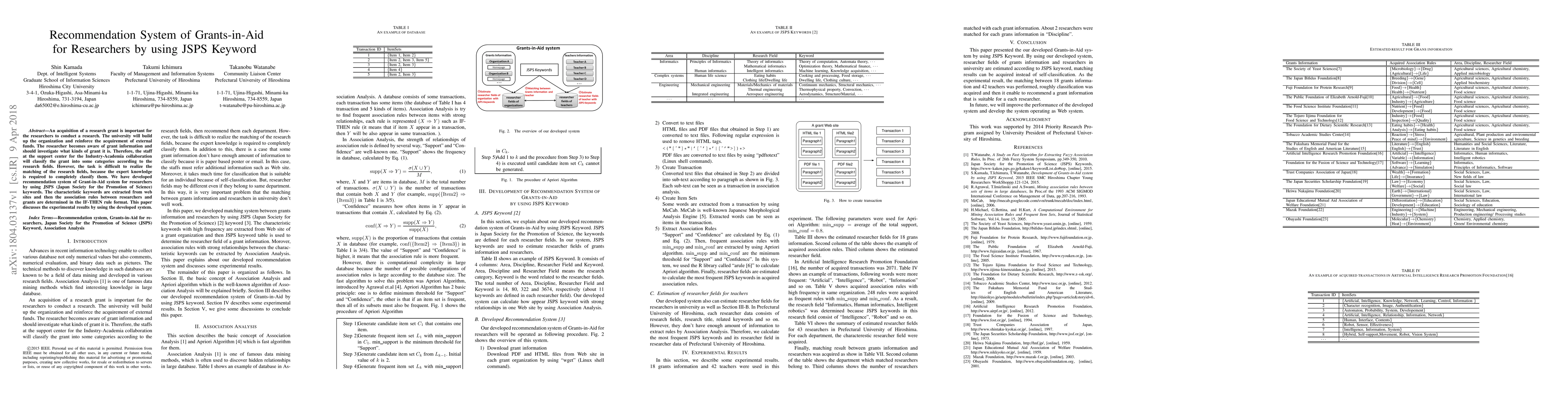 An acquisition of a research grant is important for the researchers to conduct a research. The university will build up the organization and reinforce the acquirement of external funds. The researcher becomes aware of grant information and should investigate what kinds of grant it is. Therefore, the staff at the support center for the Industry-Academia collaboration will classify the grant into some categories according to the research fields. However, the task is difficult to realize the matching of the research fields, because the expert knowledge is required to completely classify them. We have developed recommendation system of Grant-in-Aid system for researchers by using JSPS (Japan Society for the Promotion of Science) keywords. The characteristic keywords are extracted from web sites and then the association rules between researchers and grants are determined in the IF-THEN rule format. This paper discusses the experimental results by using the developed system.
