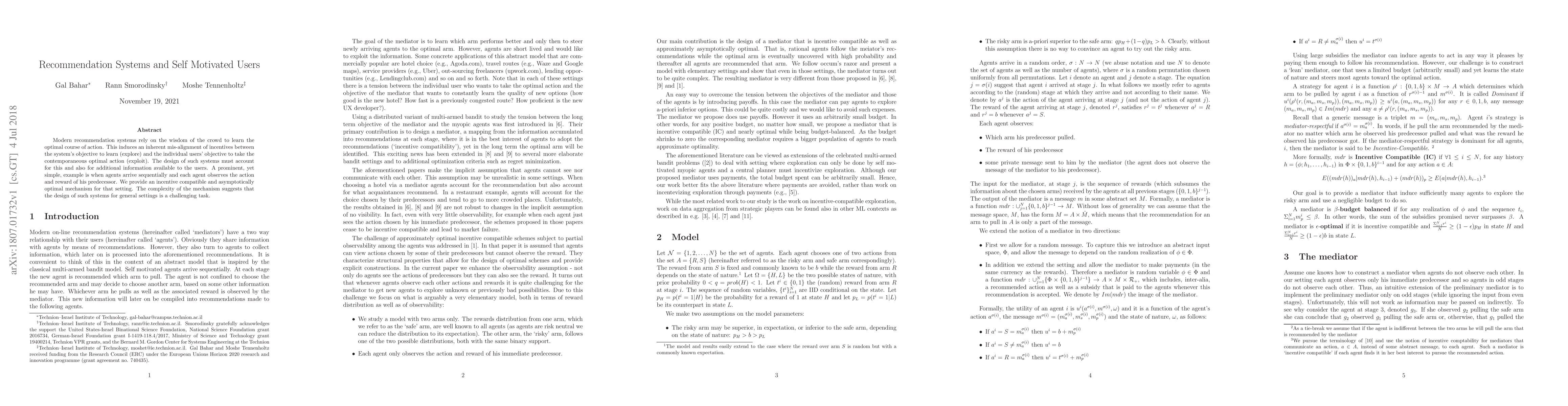 Modern recommendation systems rely on the wisdom of the crowd to learn the optimal course of action. This induces an inherent mis-alignment of incentives between the system's objective to learn (explore) and the individual users' objective to take the contemporaneous optimal action (exploit). The design of such systems must account for this and also for additional information available to the users. A prominent, yet simple, example is when agents arrive sequentially and each agent observes the action and reward of his predecessor. We provide an incentive compatible and asymptotically optimal mechanism for that setting. The complexity of the mechanism suggests that the design of such systems for general settings is a challenging task.