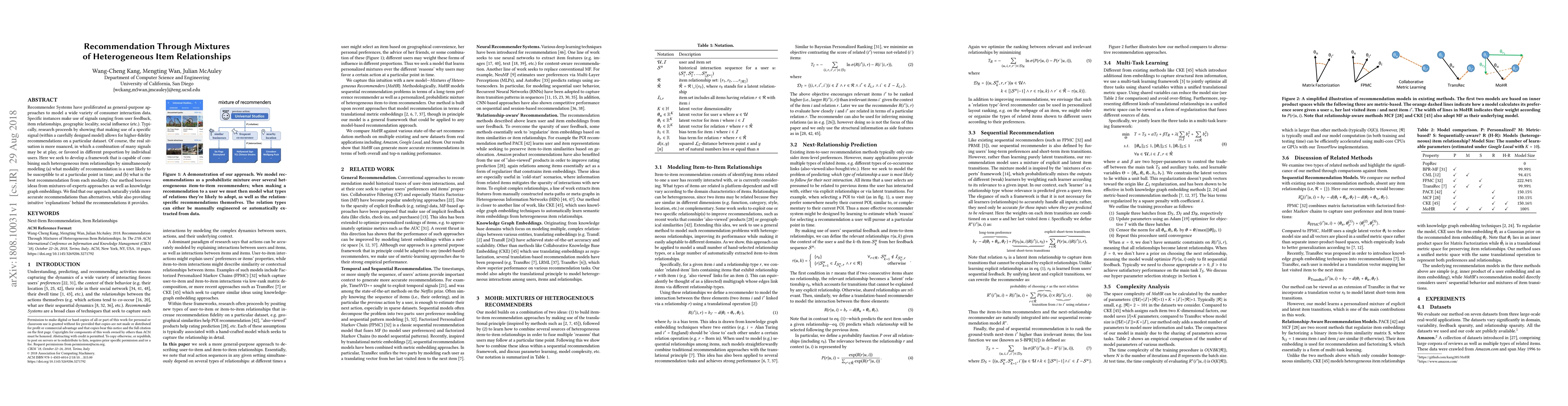 Recommender Systems have proliferated as general-purpose approaches to model a wide variety of consumer interaction data. Specific instances make use of signals ranging from user feedback, item relationships, geographic locality, social influence (etc.). Typically, research proceeds by showing that making use of a specific signal (within a carefully designed model) allows for higher-fidelity recommendations on a particular dataset. Of course, the real situation is more nuanced, in which a combination of many signals may be at play, or favored in different proportion by individual users. Here we seek to develop a framework that is capable of combining such heterogeneous item relationships by simultaneously modeling (a) what modality of recommendation is a user likely to be susceptible to at a particular point in time; and (b) what is the best recommendation from each modality. Our method borrows ideas from mixtures-of-experts approaches as well as knowledge graph embeddings. We find that our approach naturally yields more accurate recommendations than alternatives, while also providing intuitive `explanations' behind the recommendations it provides.