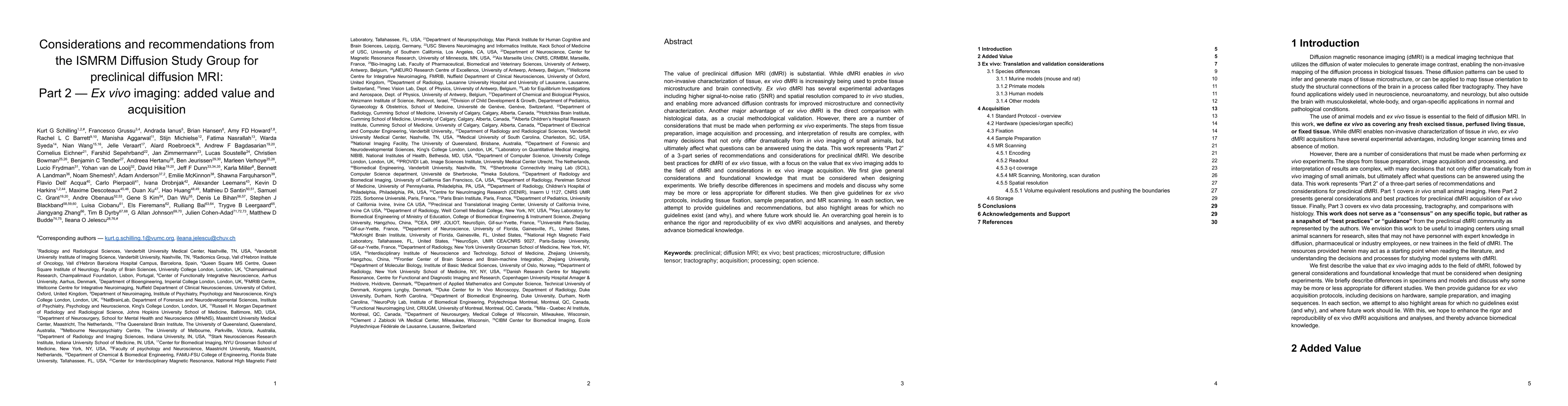 This paper provides comprehensive recommendations and guidelines for ex vivo preclinical diffusion MRI (dMRI), emphasizing best practices for tissue preparation, imaging sequences, and data processing. It aims to enhance the rigor and reproducibility of ex vivo dMRI studies, thereby advancing biomedical research through improved microstructure and connectivity characterization.