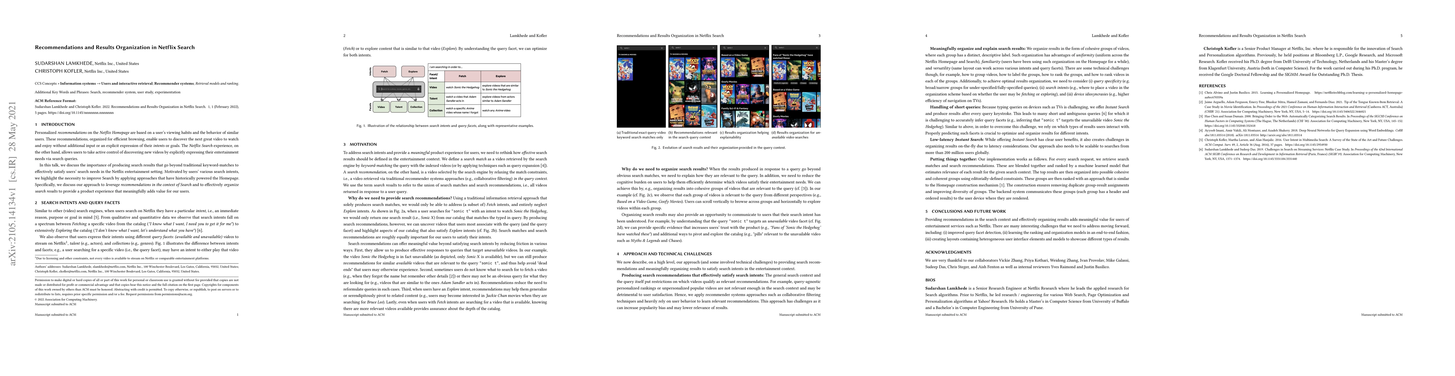 This paper discusses how Netflix enhances its search experience by integrating personalized recommendation techniques to organize search results beyond traditional keyword-matches, thereby better satisfying users' diverse search intents and providing a more valuable product experience. The approach leverages insights from the Homepage's recommendation system to improve search result organization.