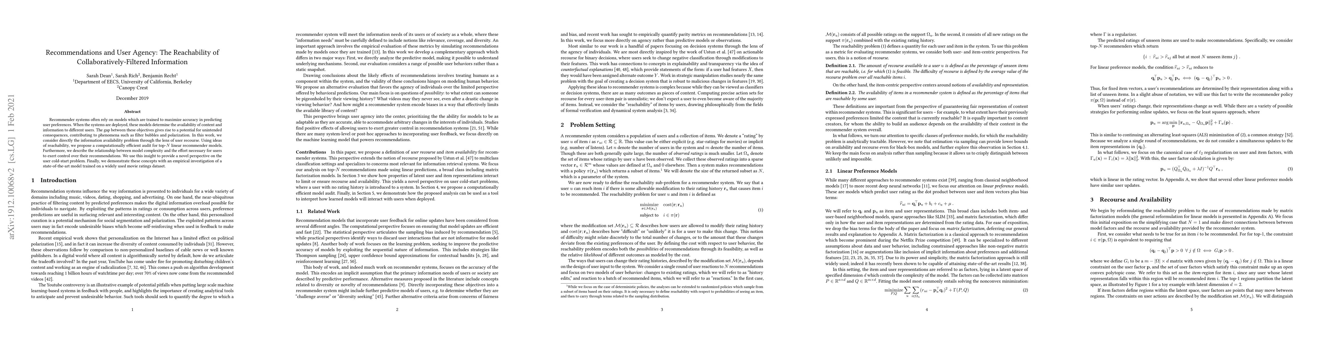 Recommender systems often rely on models which are trained to maximize accuracy in predicting user preferences. When the systems are deployed, these models determine the availability of content and information to different users. The gap between these objectives gives rise to a potential for unintended consequences, contributing to phenomena such as filter bubbles and polarization. In this work, we consider directly the information availability problem through the lens of user recourse. Using ideas of reachability, we propose a computationally efficient audit for top-$N$ linear recommender models. Furthermore, we describe the relationship between model complexity and the effort necessary for users to exert control over their recommendations. We use this insight to provide a novel perspective on the user cold-start problem. Finally, we demonstrate these concepts with an empirical investigation of a state-of-the-art model trained on a widely used movie ratings dataset.