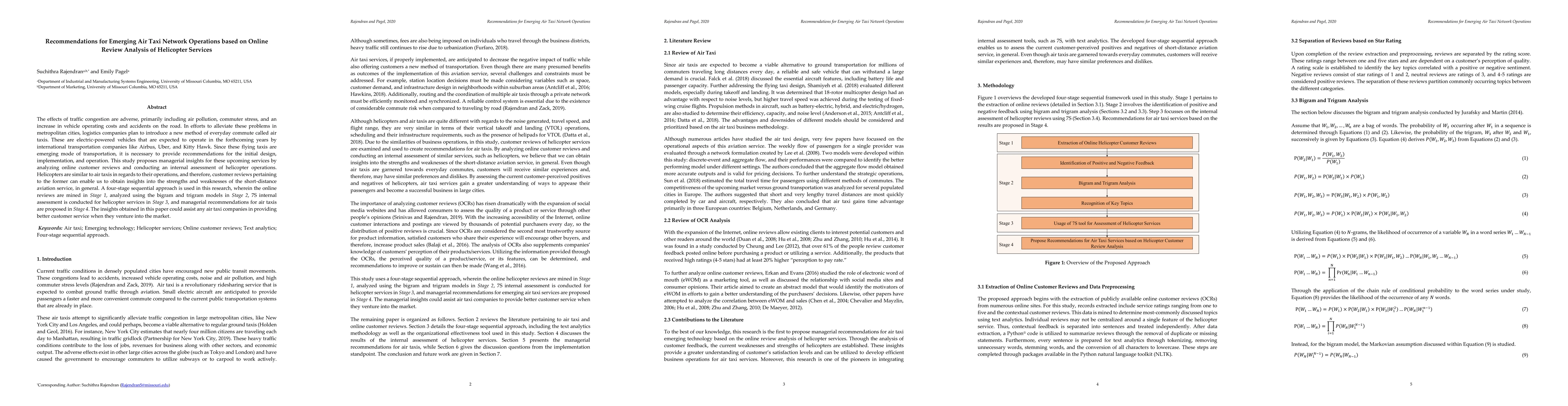 The effects of traffic congestion are adverse, primarily including air pollution, commuter stress, and an increase in vehicle operating costs and accidents on the road. In efforts to alleviate these problems in metropolitan cities, logistics companies plan to introduce a new method of everyday commute called air taxis, an Urban Air Mobility (UAM) service. These are electric-powered vehicles that are expected to operate in the forthcoming years by international transportation companies like Airbus, Uber, and Kitty Hawk. Since these flying taxis are emerging mode of transportation, it is necessary to provide recommendations for the initial design, implementation, and operation. This study proposes managerial insights for these upcoming services by analyzing online customer reviews and conducting an internal assessment of helicopter operations. Helicopters are similar to air taxis in regards to their operations, and therefore, customer reviews pertaining to the former can enable us to obtain insights into the strengths and weaknesses of the short-distance aviation service, in general. A four-stage sequential approach is used in this research, wherein the online reviews are mined in Stage 1, analyzed using the bigram and trigram models in Stage 2, 7S internal assessment is conducted for helicopter services in Stage 3, and managerial recommendations for air taxis are proposed in Stage 4. The insights obtained in this paper could assist any air taxi companies in providing better customer service when they venture into the market. Keywords: Air taxi; Emerging technology; Urban Air Mobility (UAM); Helicopter services; Online customer reviews; Text analytics;