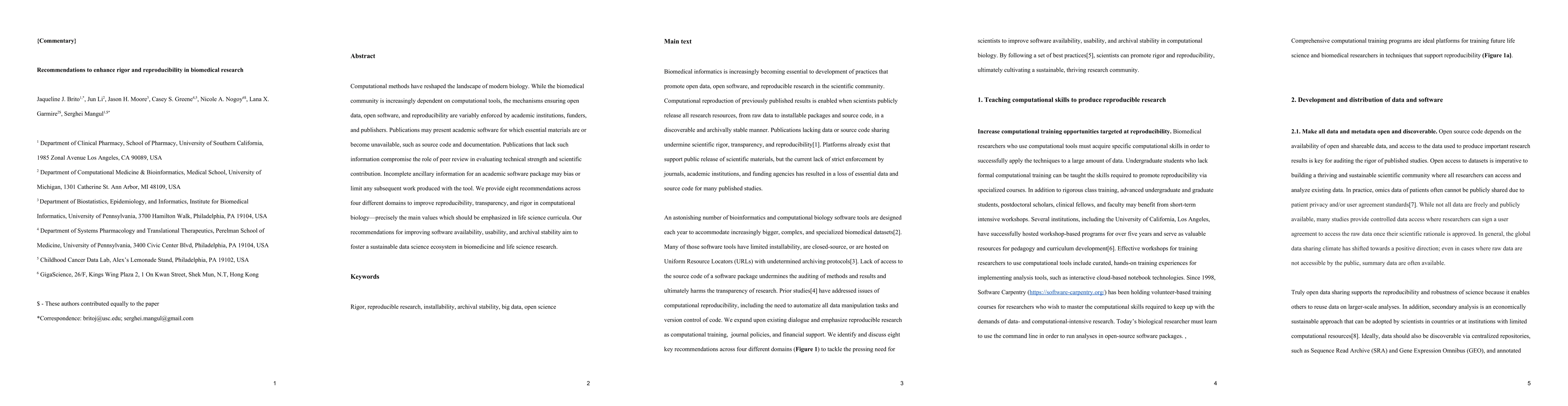 This paper outlines eight recommendations to enhance rigor and reproducibility in computational biology, emphasizing the importance of open data, open software, and transparency. The recommendations aim to improve software availability, usability, and archival stability to foster a sustainable data science ecosystem in biomedical research.