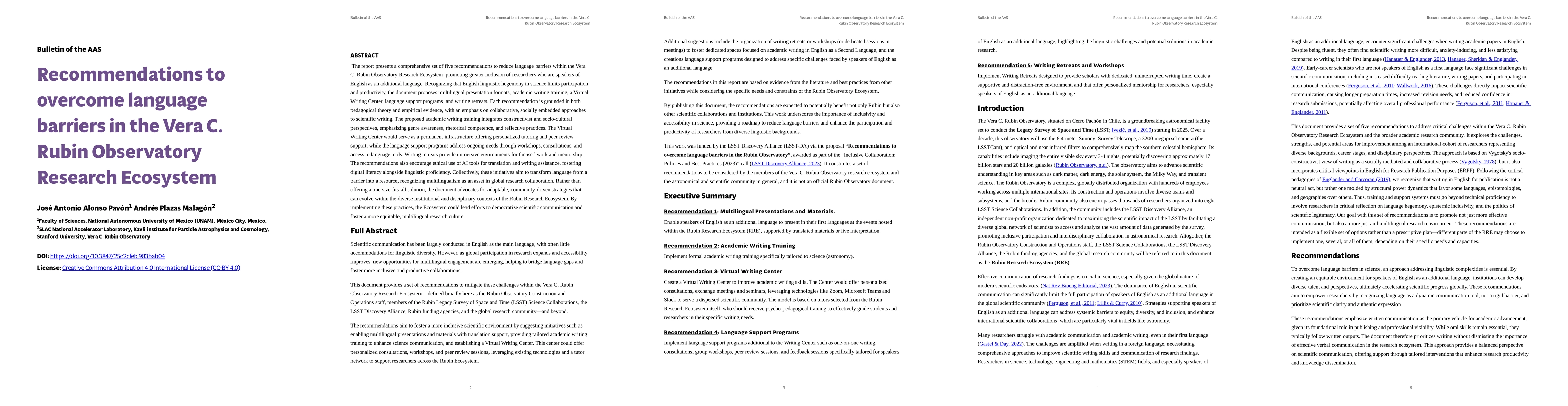The report presents a comprehensive set of five recommendations to reduce language barriers within the Vera C. Rubin Observatory Research Ecosystem, promoting greater inclusion of researchers who are speakers of English as an additional language. Recognizing that English linguistic hegemony in science limits participation and productivity, the document proposes multilingual presentation formats, academic writing training, a Virtual Writing Center, language support programs, and writing retreats. Each recommendation is grounded in both pedagogical theory and empirical evidence, with an emphasis on collaborative, socially embedded approaches to scientific writing. The proposed academic writing training integrates constructivist and socio-cultural perspectives, emphasizing genre awareness, rhetorical competence, and reflective practices. The Virtual Writing Center would serve as a permanent infrastructure offering personalized tutoring and peer review support, while the language support programs address ongoing needs through workshops, consultations, and access to language tools. Writing retreats provide immersive environments for focused work and mentorship. The recommendations also encourage ethical use of AI tools for translation and writing assistance, fostering digital literacy alongside linguistic proficiency. Collectively, these initiatives aim to transform language from a barrier into a resource, recognizing multilingualism as an asset in global research collaboration. Rather than offering a one-size-fits-all solution, the document advocates for adaptable, community-driven strategies that can evolve within the diverse institutional and disciplinary contexts of the Rubin Research Ecosystem. By implementing these practices, the Ecosystem could lead efforts to democratize scientific communication and foster a more equitable, multilingual research culture.
