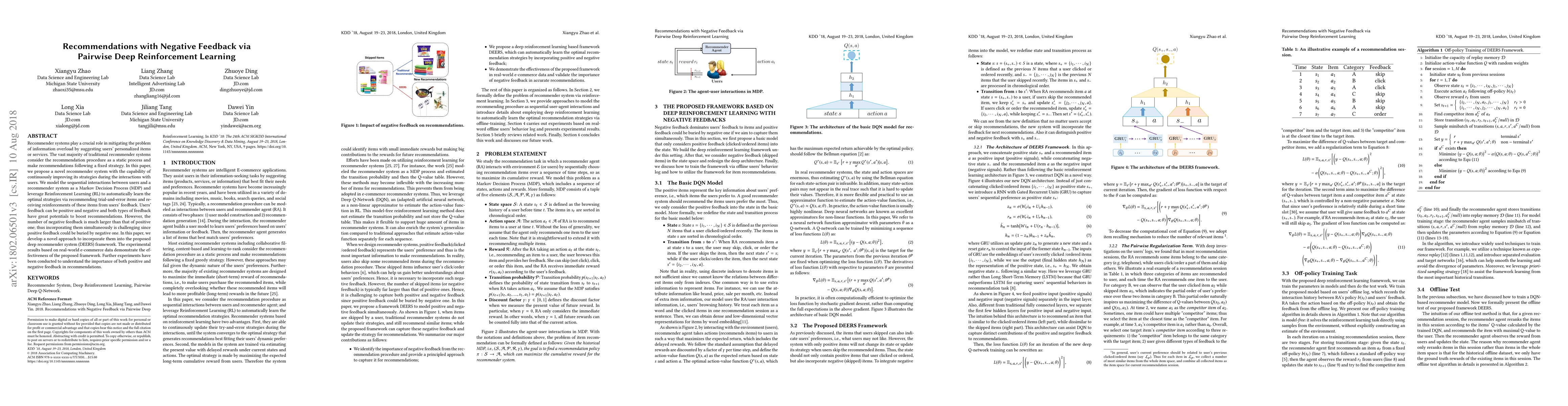 Recommender systems play a crucial role in mitigating the problem of information overload by suggesting users' personalized items or services. The vast majority of traditional recommender systems consider the recommendation procedure as a static process and make recommendations following a fixed strategy. In this paper, we propose a novel recommender system with the capability of continuously improving its strategies during the interactions with users. We model the sequential interactions between users and a recommender system as a Markov Decision Process (MDP) and leverage Reinforcement Learning (RL) to automatically learn the optimal strategies via recommending trial-and-error items and receiving reinforcements of these items from users' feedback. Users' feedback can be positive and negative and both types of feedback have great potentials to boost recommendations. However, the number of negative feedback is much larger than that of positive one; thus incorporating them simultaneously is challenging since positive feedback could be buried by negative one. In this paper, we develop a novel approach to incorporate them into the proposed deep recommender system (DEERS) framework. The experimental results based on real-world e-commerce data demonstrate the effectiveness of the proposed framework. Further experiments have been conducted to understand the importance of both positive and negative feedback in recommendations.