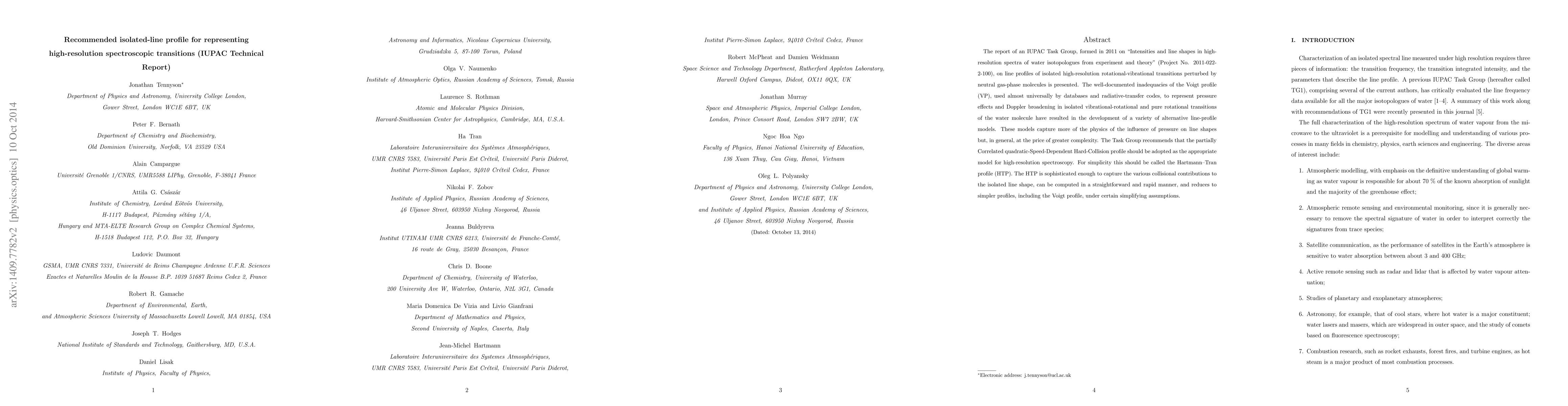 The report of an IUPAC Task Group, formed in 2011 on "Intensities and line shapes in high-resolution spectra of water isotopologues from experiment and theory" (Project No. 2011-022-2-100), on line profiles of isolated high-resolution rotational-vibrational transitions perturbed by neutral gas-phase molecules is presented. The well-documented inadequacies of the Voigt profile (VP), used almost universally by databases and radiative-transfer codes, to represent pressure effects and Doppler broadening in isolated vibrational-rotational and pure rotational transitions of the water molecule have resulted in the development of a variety of alternative line-profile models. These models capture more of the physics of the influence of pressure on line shapes but, in general, at the price of greater complexity. The Task Group recommends that the partially Correlated quadratic-Speed-Dependent Hard-Collision profile should be adopted as the appropriate model for high-resolution spectroscopy. For simplicity this should be called the Hartmann--Tran profile (HTP). The HTP is sophisticated enough to capture the various collisional contributions to the isolated line shape, can be computed in a straightforward and rapid manner, and reduces to simpler profiles, including the Voigt profile, under certain simplifying assumptions.