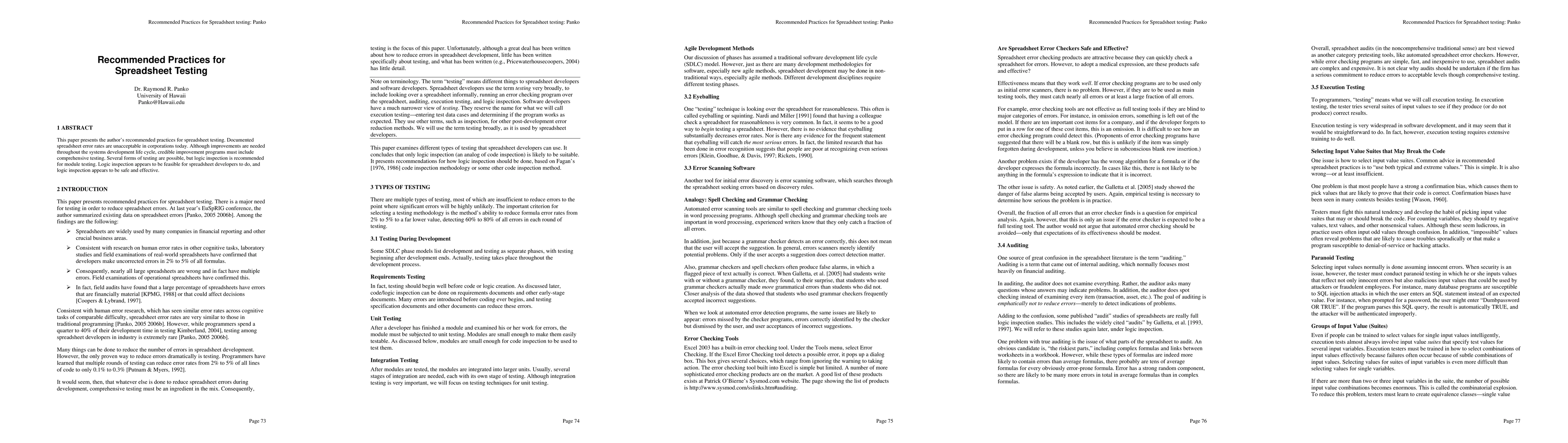 This paper outlines recommended practices for spreadsheet testing to address high error rates, emphasizing the importance of comprehensive testing in the systems development life cycle. Logic inspection is recommended for module testing due to its feasibility, safety, and effectiveness for spreadsheet developers.