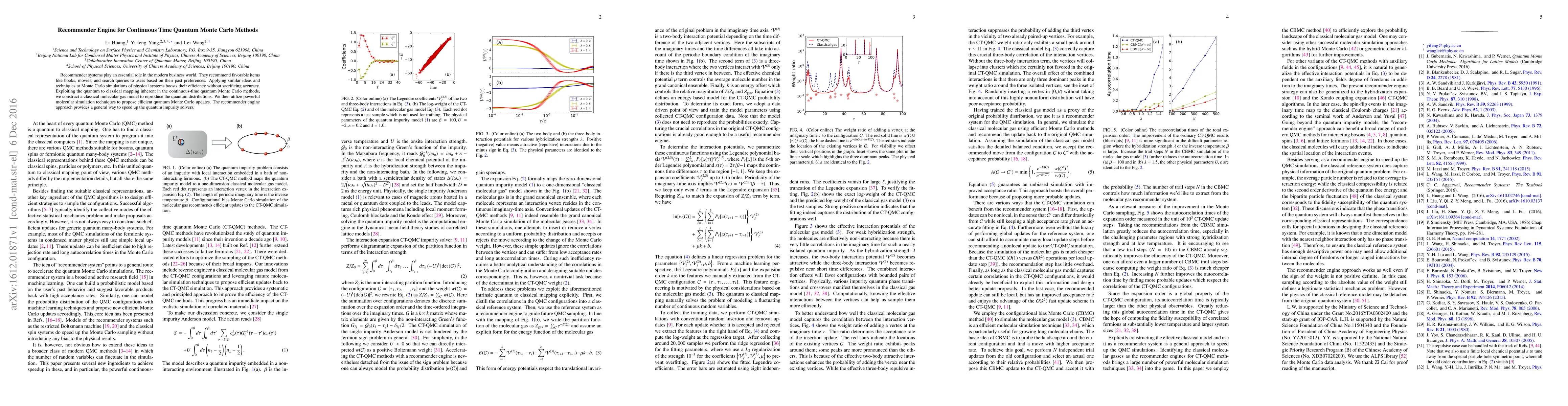 This paper proposes a recommender engine to enhance the efficiency of continuous-time quantum Monte Carlo methods by leveraging classical molecular simulation techniques. The approach maps quantum distributions to a classical model, enabling faster quantum impurity solver updates without compromising accuracy.