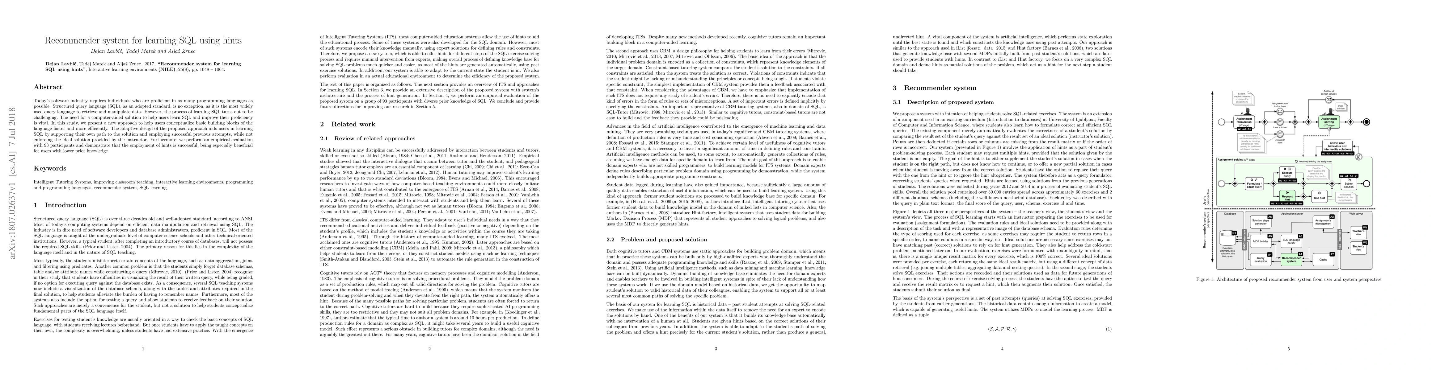 Today's software industry requires individuals who are proficient in as many programming languages as possible. Structured query language (SQL), as an adopted standard, is no exception, as it is the most widely used query language to retrieve and manipulate data. However, the process of learning SQL turns out to be challenging. The need for a computer-aided solution to help users learn SQL and improve their proficiency is vital. In this study, we present a new approach to help users conceptualize basic building blocks of the language faster and more efficiently. The adaptive design of the proposed approach aids users in learning SQL by supporting their own path to the solution and employing successful previous attempts, while not enforcing the ideal solution provided by the instructor. Furthermore, we perform an empirical evaluation with 93 participants and demonstrate that the employment of hints is successful, being especially beneficial for users with lower prior knowledge.