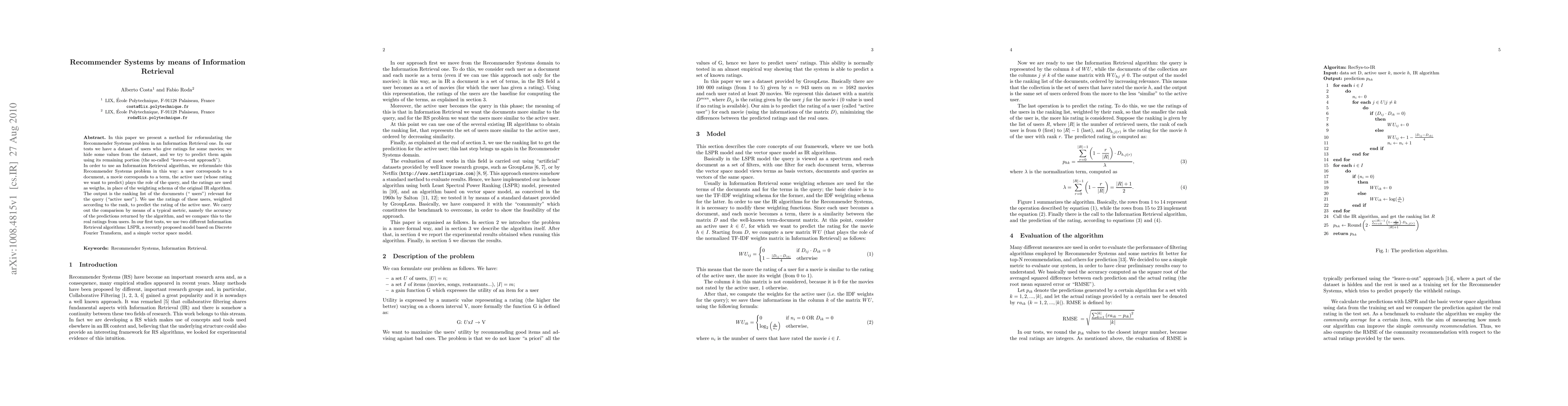 In this paper we present a method for reformulating the Recommender Systems problem in an Information Retrieval one. In our tests we have a dataset of users who give ratings for some movies; we hide some values from the dataset, and we try to predict them again using its remaining portion (the so-called "leave-n-out approach"). In order to use an Information Retrieval algorithm, we reformulate this Recommender Systems problem in this way: a user corresponds to a document, a movie corresponds to a term, the active user (whose rating we want to predict) plays the role of the query, and the ratings are used as weigths, in place of the weighting schema of the original IR algorithm. The output is the ranking list of the documents ("users") relevant for the query ("active user"). We use the ratings of these users, weighted according to the rank, to predict the rating of the active user. We carry out the comparison by means of a typical metric, namely the accuracy of the predictions returned by the algorithm, and we compare this to the real ratings from users. In our first tests, we use two different Information Retrieval algorithms: LSPR, a recently proposed model based on Discrete Fourier Transform, and a simple vector space model.