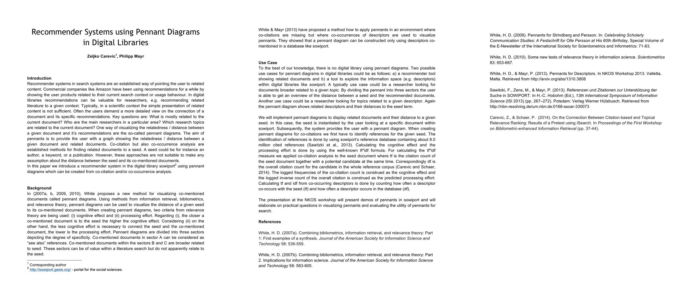 In digital libraries recommendations can be valuable for researchers, e.g. recommending related literature to a given context. Typically, in a scientific context the simple presentation of related content is not sufficient. Often the users demand a more detailed view on the connection of a document and its specific recommendations. The aim of pennants introduced by Howard White (2007) is to provide the user with a graph showing the relatedness / distance between a given document and related documents. Co-citation but also co-occurrence analysis are established methods for finding related documents to a seed. A seed could be for instance an author, a keyword, or a publication. In this paper we introduce a recommender system in the digital library sowiport using pennant diagrams which can be created from co-citation and/or co-occurrence analysis. The presentation at the NKOS workshop will present demos of pennants in sowiport and will elaborate on practical questions in visualizing pennants and evaluating the utility of pennants for search.