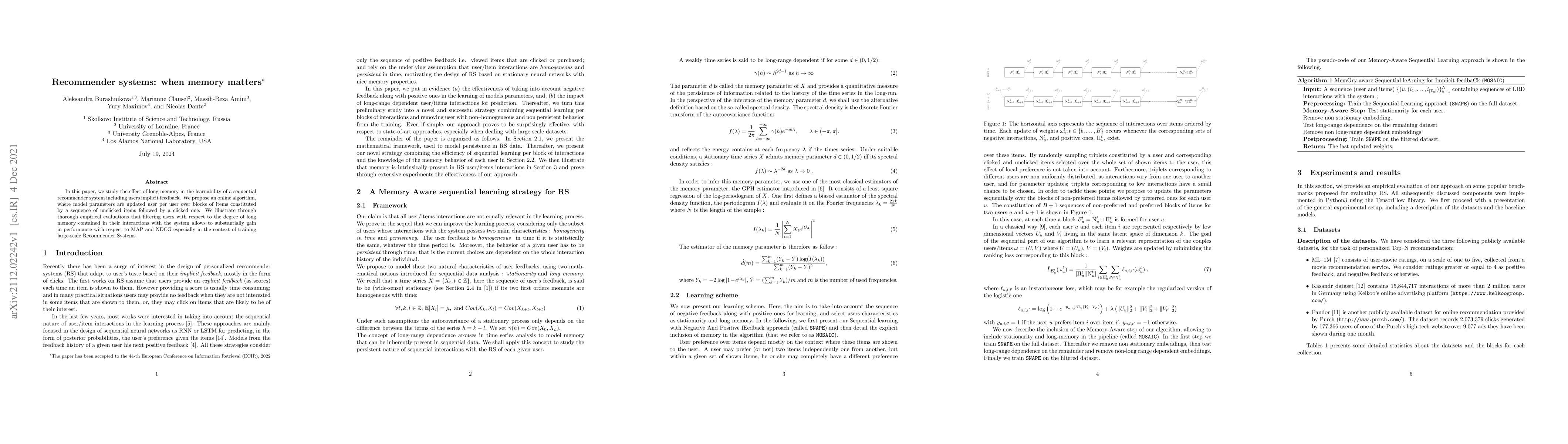 In this paper, we study the effect of long memory in the learnability of a sequential recommender system including users' implicit feedback. We propose an online algorithm, where model parameters are updated user per user over blocks of items constituted by a sequence of unclicked items followed by a clicked one. We illustrate through thorough empirical evaluations that filtering users with respect to the degree of long memory contained in their interactions with the system allows to substantially gain in performance with respect to MAP and NDCG, especially in the context of training large-scale Recommender Systems.