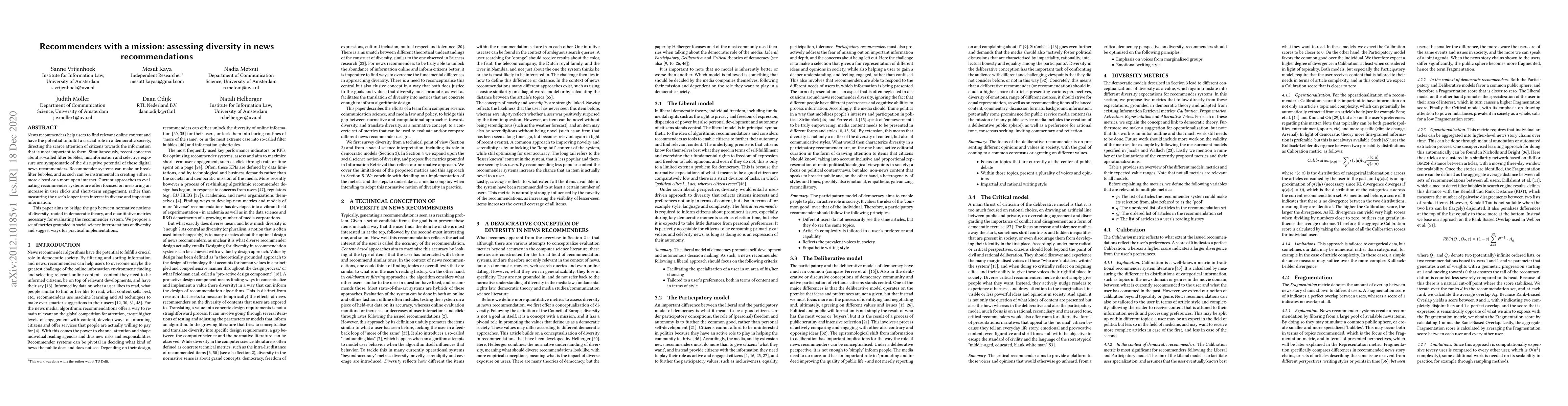 News recommenders help users to find relevant online content and have the potential to fulfill a crucial role in a democratic society, directing the scarce attention of citizens towards the information that is most important to them. Simultaneously, recent concerns about so-called filter bubbles, misinformation and selective exposure are symptomatic of the disruptive potential of these digital news recommenders. Recommender systems can make or break filter bubbles, and as such can be instrumental in creating either a more closed or a more open internet. Current approaches to evaluating recommender systems are often focused on measuring an increase in user clicks and short-term engagement, rather than measuring the user's longer term interest in diverse and important information. This paper aims to bridge the gap between normative notions of diversity, rooted in democratic theory, and quantitative metrics necessary for evaluating the recommender system. We propose a set of metrics grounded in social science interpretations of diversity and suggest ways for practical implementations.