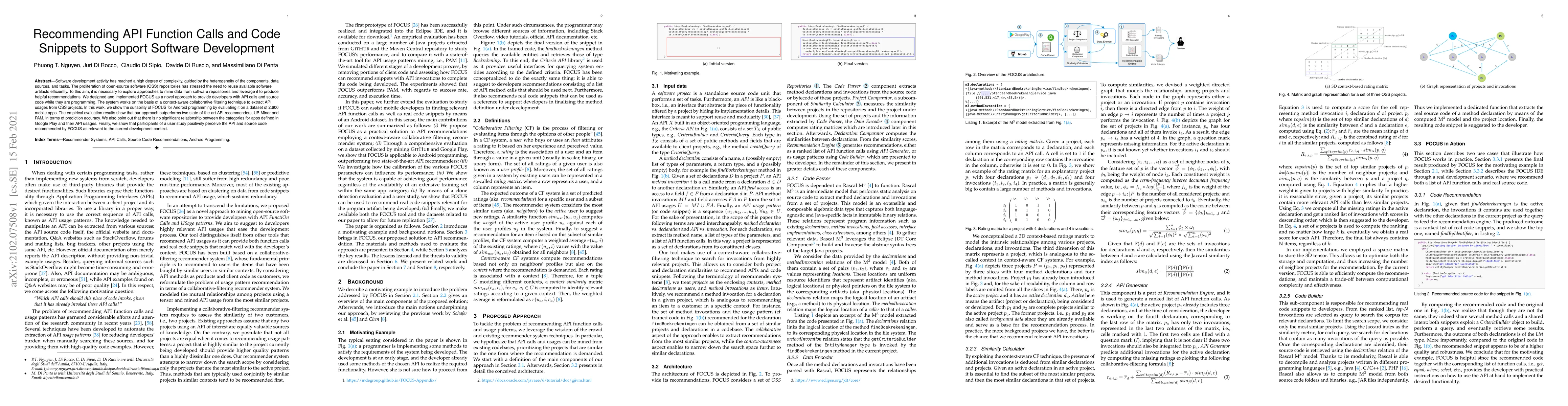 Software development activity has reached a high degree of complexity, guided by the heterogeneity of the components, data sources, and tasks. The proliferation of open-source software (OSS) repositories has stressed the need to reuse available software artifacts efficiently. To this aim, it is necessary to explore approaches to mine data from software repositories and leverage it to produce helpful recommendations. We designed and implemented FOCUS as a novel approach to provide developers with API calls and source code while they are programming. The system works on the basis of a context-aware collaborative filtering technique to extract API usages from OSS projects. In this work, we show the suitability of FOCUS for Android programming by evaluating it on a dataset of 2,600 mobile apps. The empirical evaluation results show that our approach outperforms two state-of-the-art API recommenders, UP-Miner and PAM, in terms of prediction accuracy. We also point out that there is no significant relationship between the categories for apps defined in Google Play and their API usages. Finally, we show that participants of a user study positively perceive the API and source code recommended by FOCUS as relevant to the current development context.