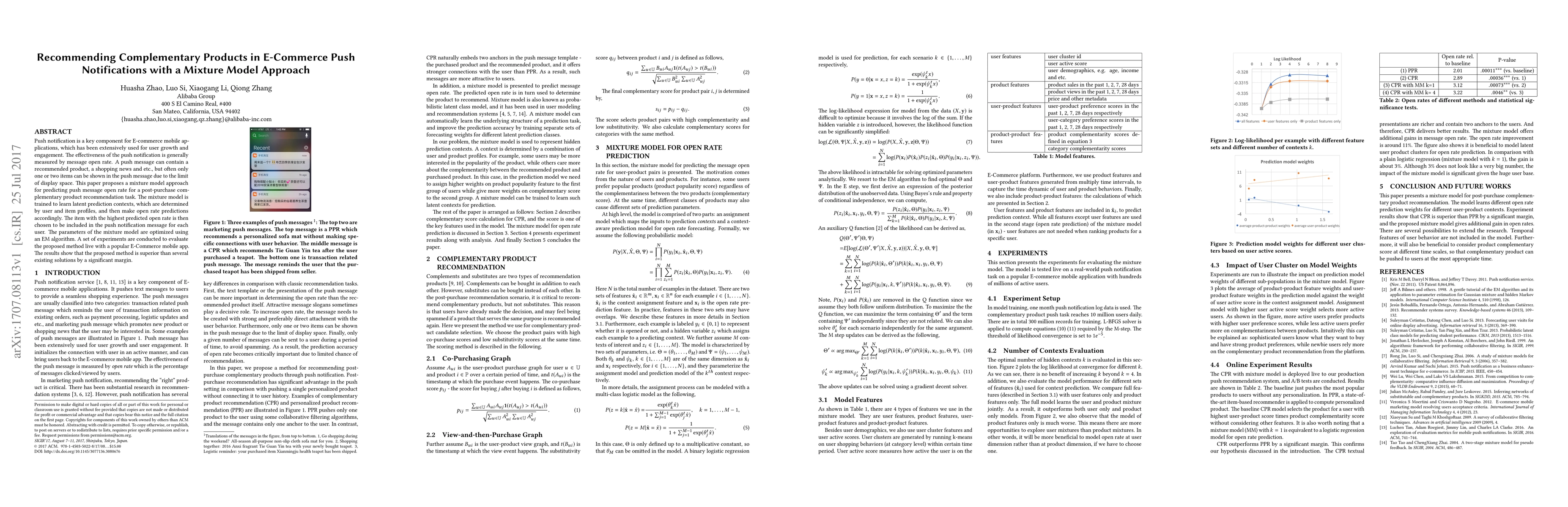 This paper proposes a mixture model approach to recommend complementary products for push notifications in E-commerce apps, optimizing the open rate prediction using an EM algorithm. The method outperforms existing solutions in live experiments, enhancing user engagement.