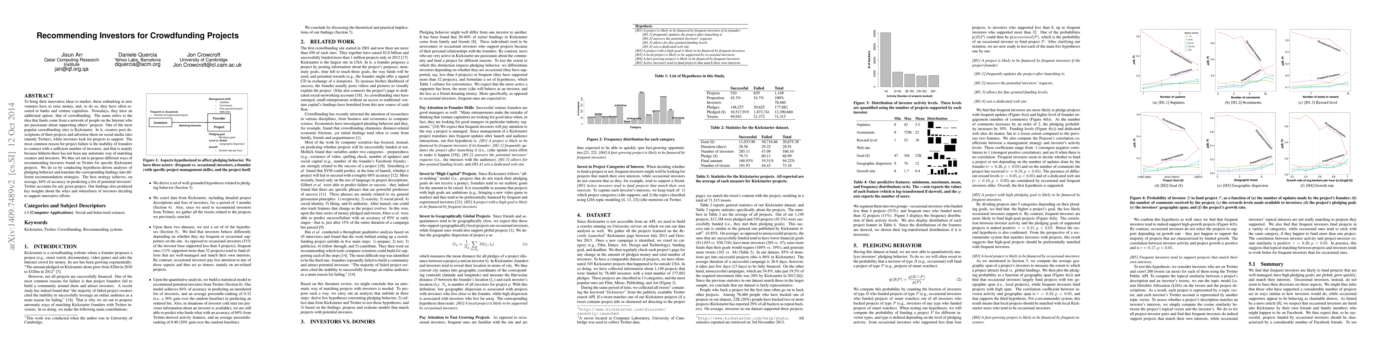 To bring their innovative ideas to market, those embarking in new ventures have to raise money, and, to do so, they have often resorted to banks and venture capitalists. Nowadays, they have an additional option: that of crowdfunding. The name refers to the idea that funds come from a network of people on the Internet who are passionate about supporting others' projects. One of the most popular crowdfunding sites is Kickstarter. In it, creators post descriptions of their projects and advertise them on social media sites (mainly Twitter), while investors look for projects to support. The most common reason for project failure is the inability of founders to connect with a sufficient number of investors, and that is mainly because hitherto there has not been any automatic way of matching creators and investors. We thus set out to propose different ways of recommending investors found on Twitter for specific Kickstarter projects. We do so by conducting hypothesis-driven analyses of pledging behavior and translate the corresponding findings into different recommendation strategies. The best strategy achieves, on average, 84% of accuracy in predicting a list of potential investors' Twitter accounts for any given project. Our findings also produced key insights about the whys and wherefores of investors deciding to support innovative efforts.