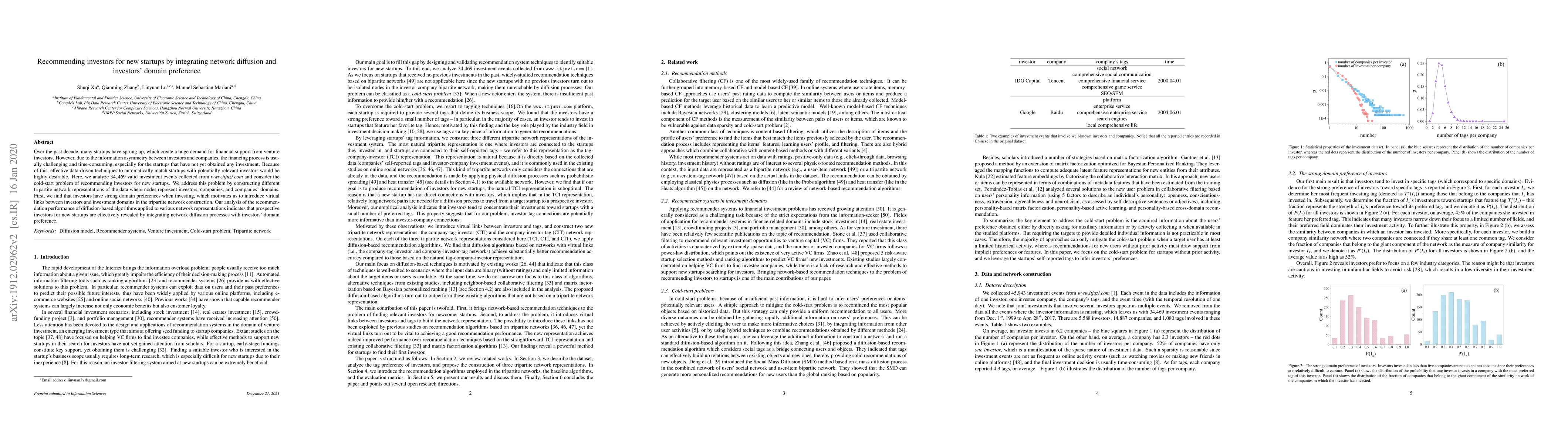 Over the past decade, many startups have sprung up, which create a huge demand for financial support from venture investors. However, due to the information asymmetry between investors and companies, the financing process is usually challenging and time-consuming, especially for the startups that have not yet obtained any investment. Because of this, effective data-driven techniques to automatically match startups with potentially relevant investors would be highly desirable. Here, we analyze 34,469 valid investment events collected from www.itjuzi.com and consider the cold-start problem of recommending investors for new startups. We address this problem by constructing different tripartite network representations of the data where nodes represent investors, companies, and companies' domains. First, we find that investors have strong domain preferences when investing, which motivates us to introduce virtual links between investors and investment domains in the tripartite network construction. Our analysis of the recommendation performance of diffusion-based algorithms applied to various network representations indicates that prospective investors for new startups are effectively revealed by integrating network diffusion processes with investors' domain preference.