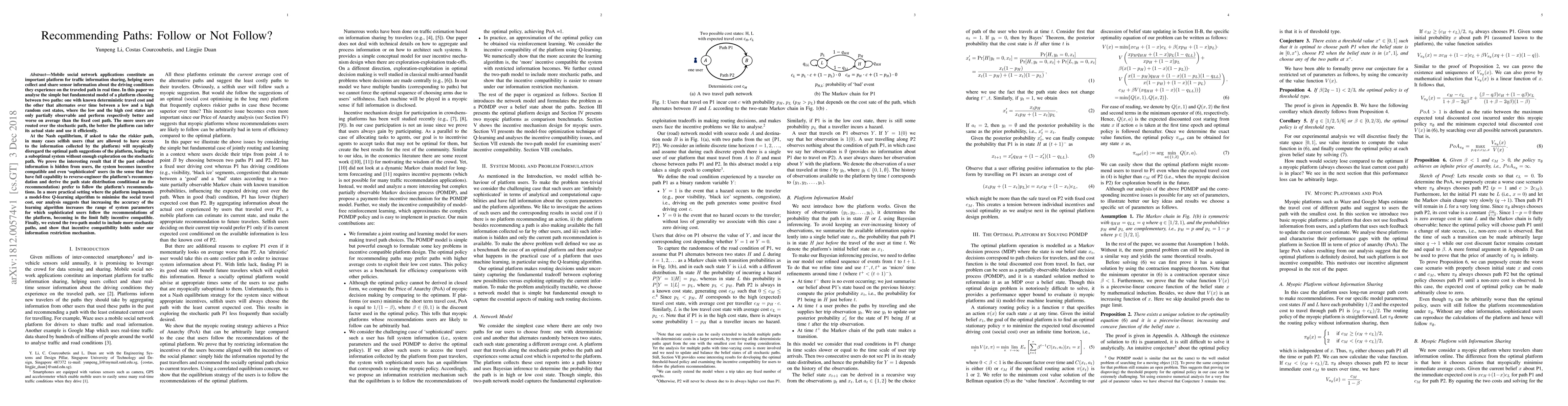 Mobile social network applications constitute an important platform for traffic information sharing, helping users collect and share sensor information about the driving conditions they experience on the traveled path in real time. In this paper we analyse the simple but fundamental model of a platform choosing between two paths: one with known deterministic travel cost and the other that alternates over time between a low and a high random cost states, where the low and the high cost states are only partially observable and perform respectively better and worse on average than the fixed cost path. The more users are routed over the stochastic path, the better the platform can infer its actual state and use it efficiently. At the Nash equilibrium, if asked to take the riskier path, in many cases selfish users will myopically disregard the optimal path suggestions of the platform, leading to a suboptimal system without enough exploration on the stochastic path. We prove the interesting result that if the past collected information is hidden from users, the system becomes incentive compatible and even `sophisticated' users (in the sense that they have full capability to reverse-engineer the platform's recommendation and derive the path state distribution conditional on the recommendation) prefer to follow the platform's recommendations. In a more practical setting where the platform implements a model-free Q-learning algorithm to minimise the social travel cost, our analysis suggests that increasing the accuracy of the learning algorithm increases the range of system parameters for which sophisticated users follow ! the recommendations of the platform, becoming in the limit fully incentive compatible. Finally, we extend the two-path model to include more stochastic paths, and show that incentive compatibility holds under our information restriction mechanism.