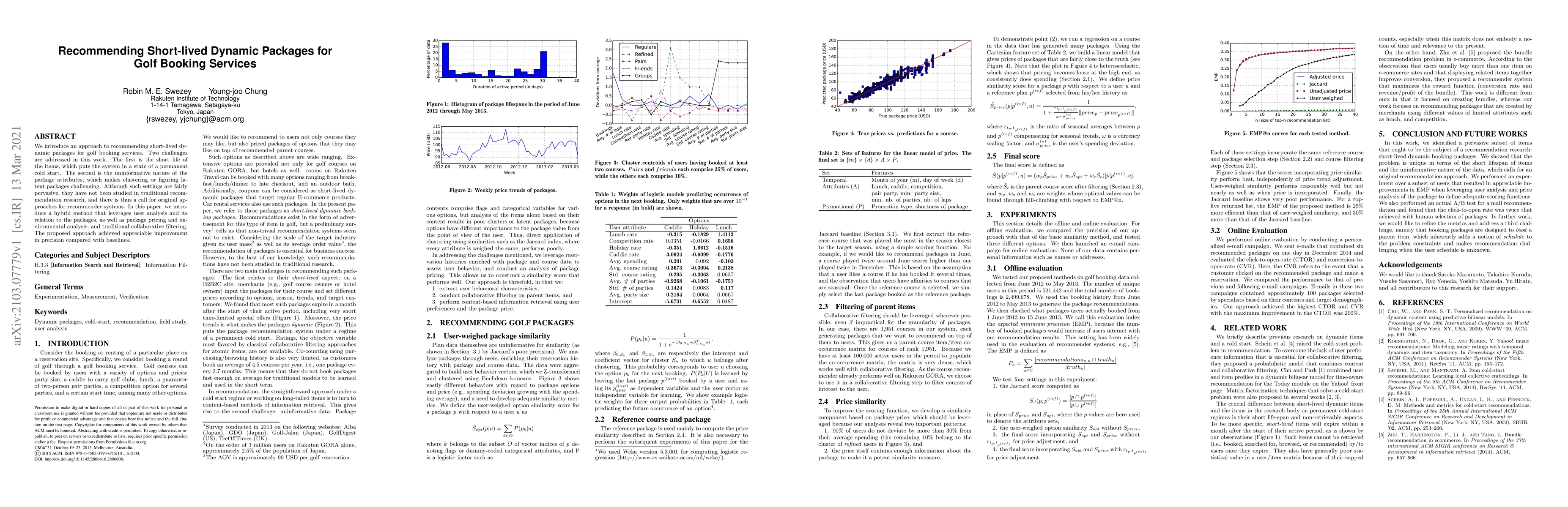 A new approach is introduced for recommending short-lived dynamic packages in golf booking services, combining user analysis, package pricing, environmental factors, and traditional collaborative filtering to improve precision.